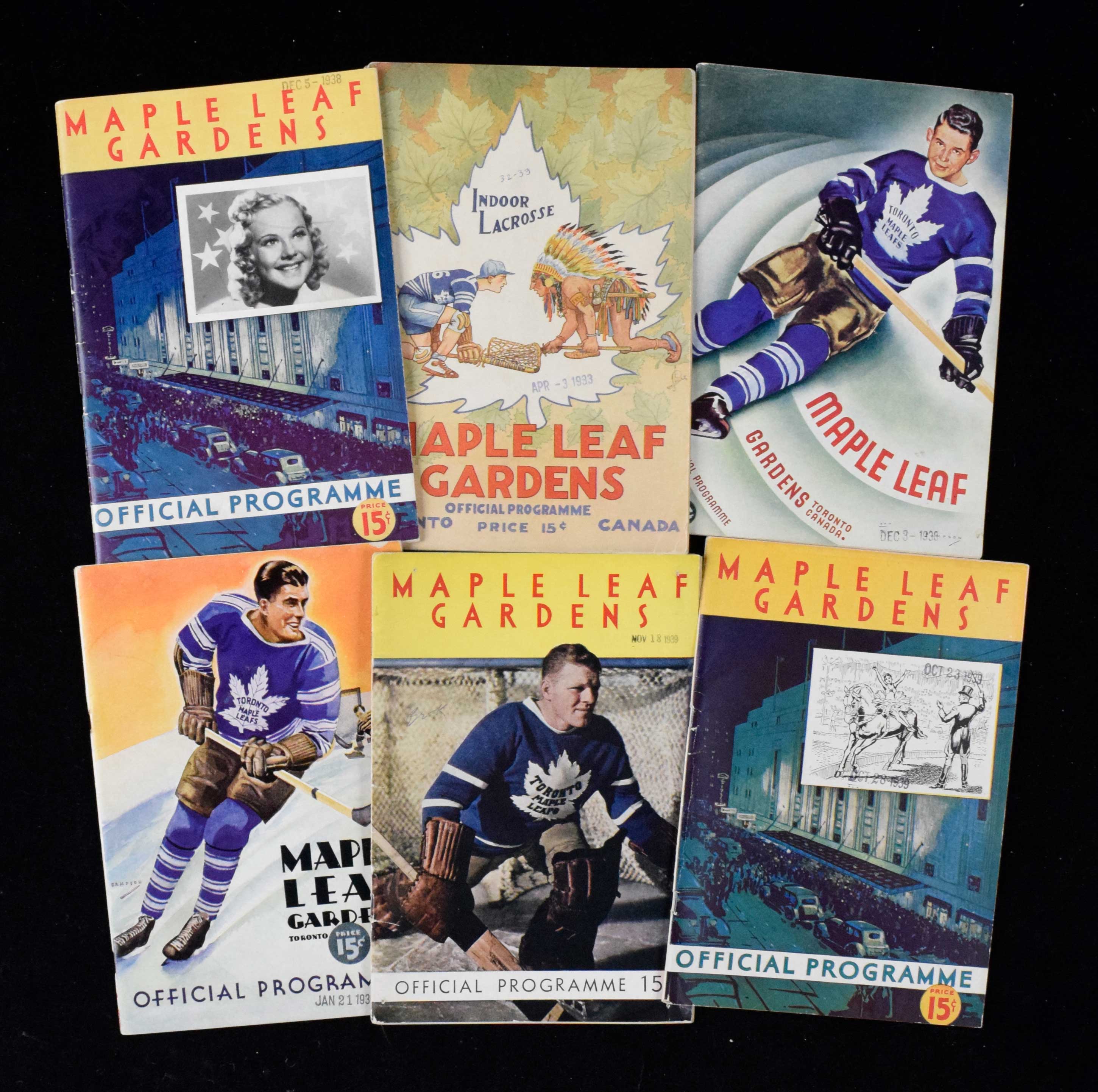 Description:Lot of (9) Maple Leaf Gardens programs from 1933-1971 (VG-NM). Includes 4/3/1933 Boston Bruins at Toronto Maple Leafs program from Stanley Cup semi-finals (VG/EX), 12/3/1938 Montreal Canadiens at Maple Leafs (EX-EX/MT), 12/5/1938 Sonja Henie and the Hollywood Ice Revue (EX-EX/MT), 1/21/1939 New York Americans at Maple Leafs (EX), October 1939 The Circus (VG/EX), 11/18/1939 Detroit Red Wings at Maple Leafs (VG-VG/EX), 11/22/1940 Guelph Biltmores at Bowles Rangers (EX), 10/5/1955 Maple Leaf Gardens Open House (EX/MT-NM), and 1/14/1971 Cincinnati Royals vs Los Angeles Lakers (EX ink marks on back cover).