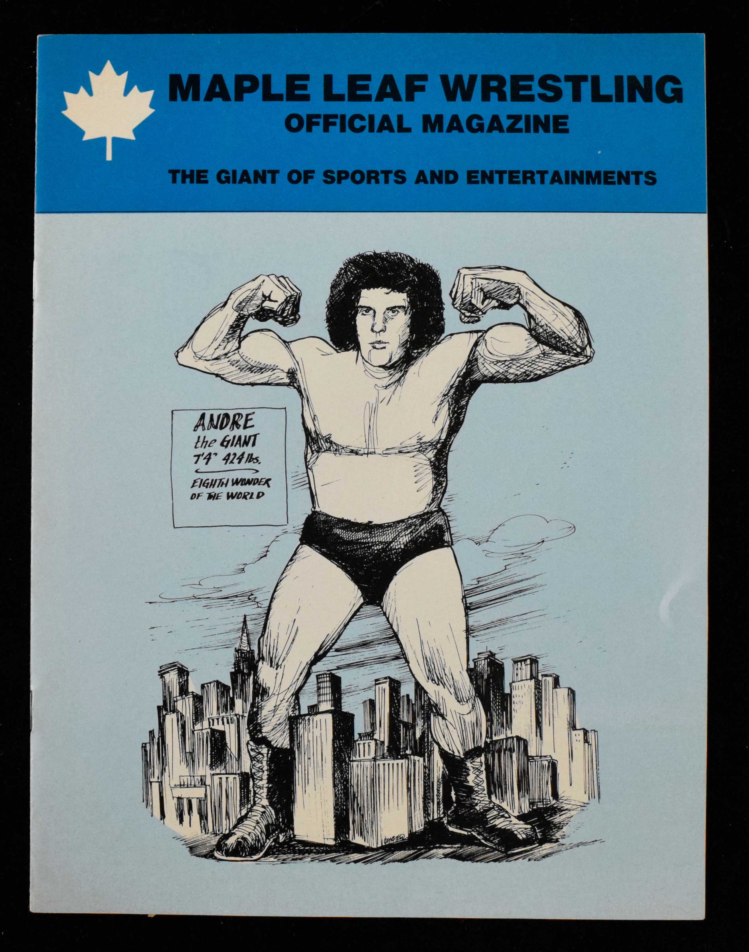 Description:Rare 1977 Maple Leaf Wrestling program with Andre The Giant cover (NM). Undated, but likely from the July 10th event which featured Andre The Giant vs Ken Patera, Superstar Billy Graham defeating Chief Jay Strongbow to retain his WWWF title, and Harley Race defeating The Sheik to retain his NWA title: NM