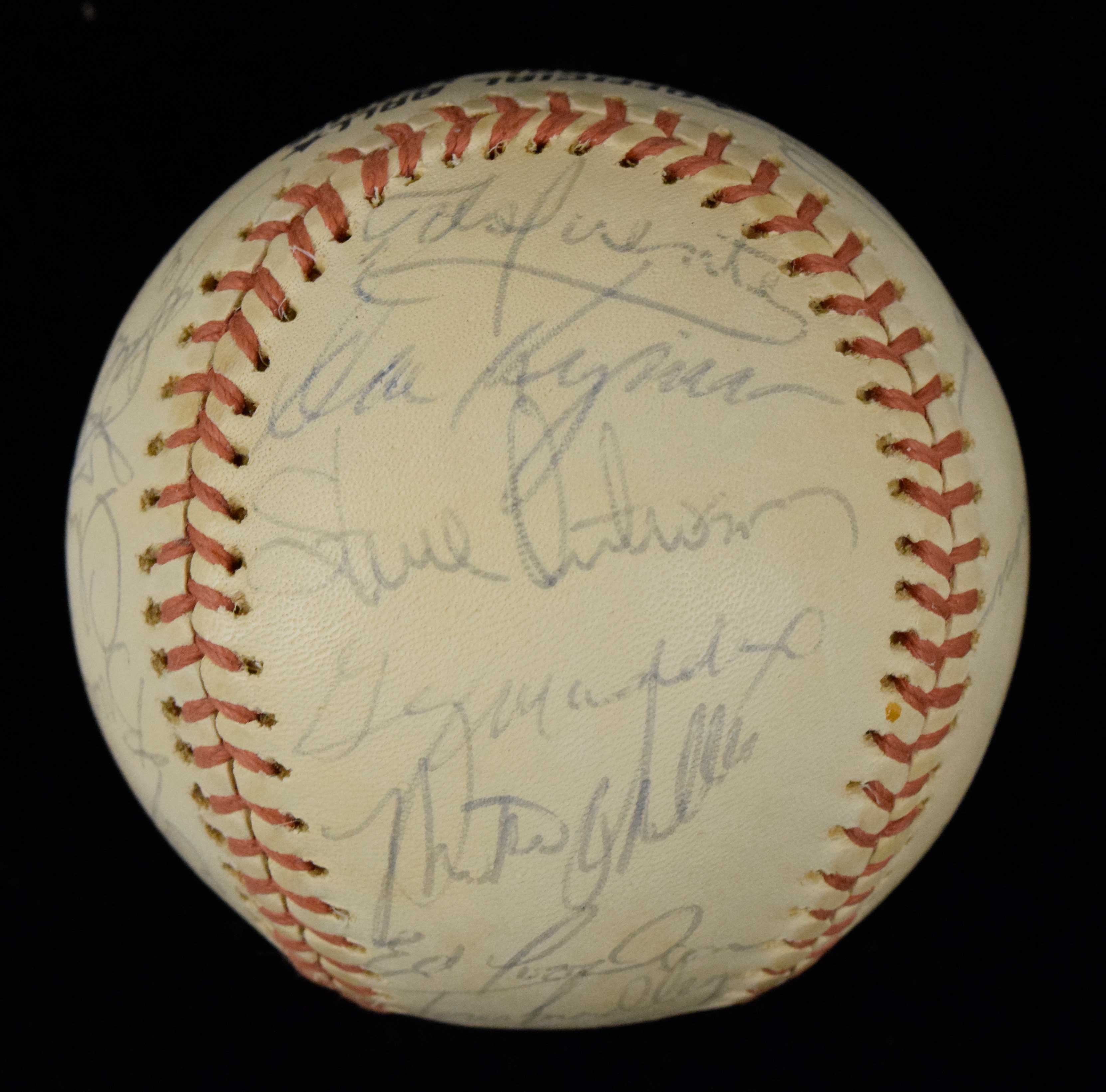Description:1974 San Francisco Giants team signed baseball - PSA/DNA (EX/MT). C.Feeney NL ball signed by (23) members of the 1974 Giants including Dave Kingman, Gary Matthews, Jim Barr, Garry Maddox, Chris Speier, John D'Acquisto, Charlie Williams, Dave Rader, Steve Ontiveros, Gary Thomasson, Tito Fuentes, Ed Goodson, and others (Bonds and Westrum are clubhouse signed). Signatures rate 6/7 to 8/9 out of 10. Includes full LOA from PSA/DNA. Light, even toning: EX/MT