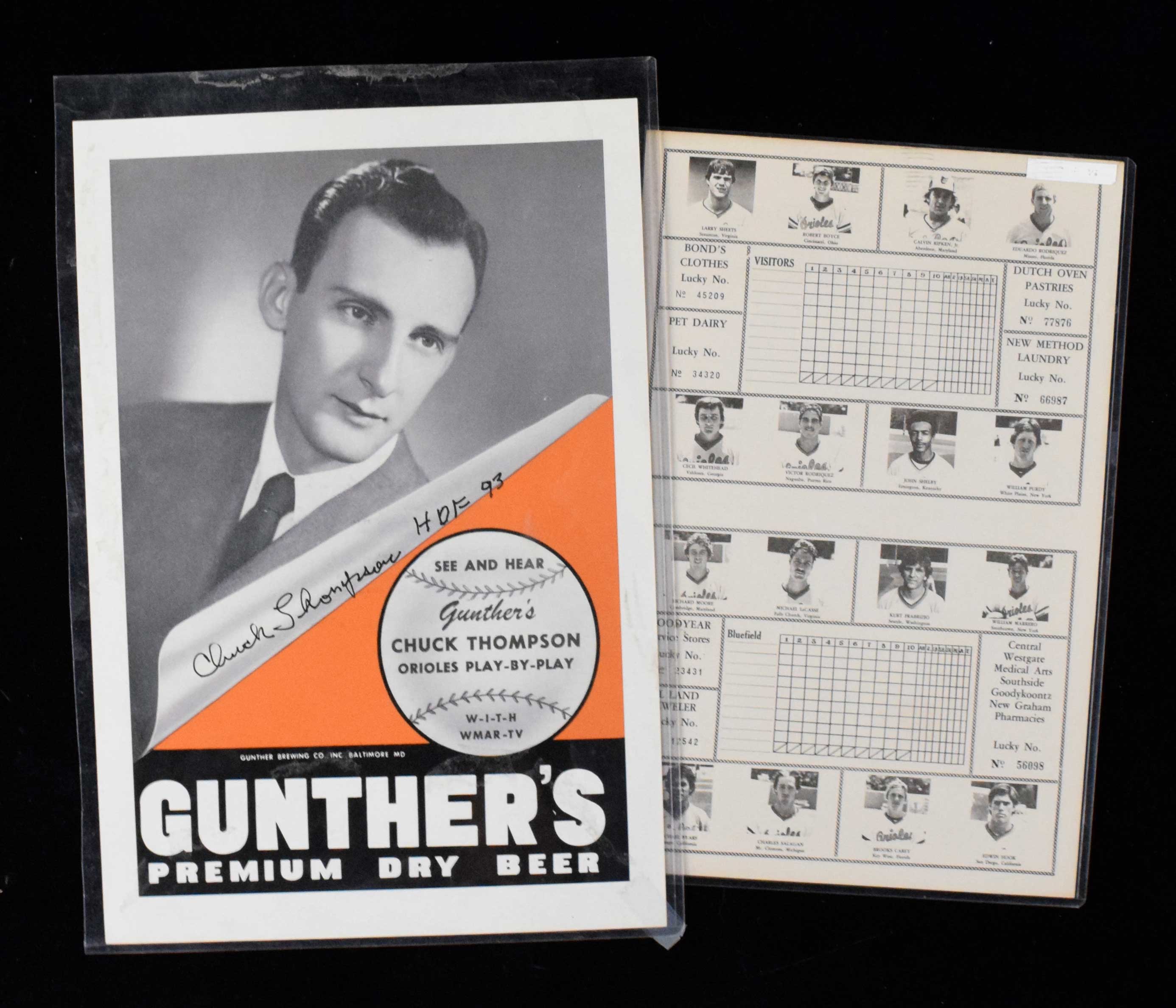 Description:1978 Bluefield Orioles program (Cal Ripken 1st pro season) plus Chuck Thompson signed & inscribed poster (EX/MT-NM/MT). Includes 1978 Bluefield Orioles program picturing Calvin Ripken Jr on the scorecard page (EX/MT-NM unscored), and 13"x19" Orioles play-by-play reproduction poster signed by Chuck Thompson with "HOF 93" in black marker rating 9/10 out of 10 (NM-NM/MT notation by a previous owner written on the back).