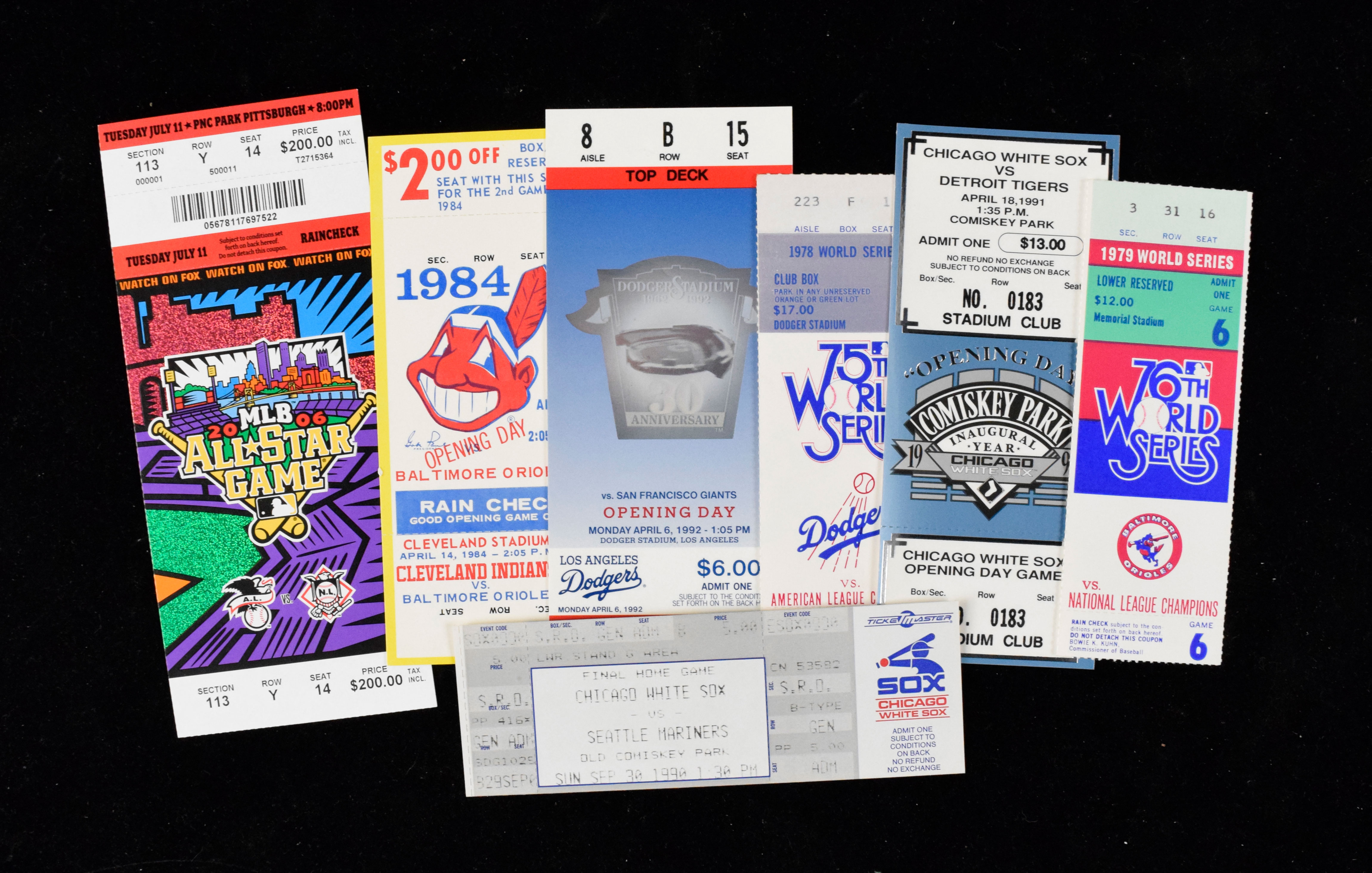Description:Very nice lot of (21) 1978-2006 World Series, All-Star, and other notable game full tickets and stubs (Avg. EX/MT or better) Includes 1978 World Series Game (6) ticket stub; (3) 1979 World Series Game (6) ticket stubs; 1990 All-Star Game ticket stub; (5) 1991 All-Star Game ticket stubs; 1992 Dodgers Opening Day full ticket; 1984 Indians Opening Day proof ticket (no seat numbers); (2) 1990 Old Comiskey Park final game full tickets; (2) 1991 New Comiskey Park Opening Day full tickets; 1992 camden opening ticket; (2) 1993 All-Star Game full tickets; (2) 2006 All-Star Game full tickets (plus 2 workout day tickets). Varying degrees/types of mostly very light wear and average piece is EX/MT or better: Avg. EX/MT or better