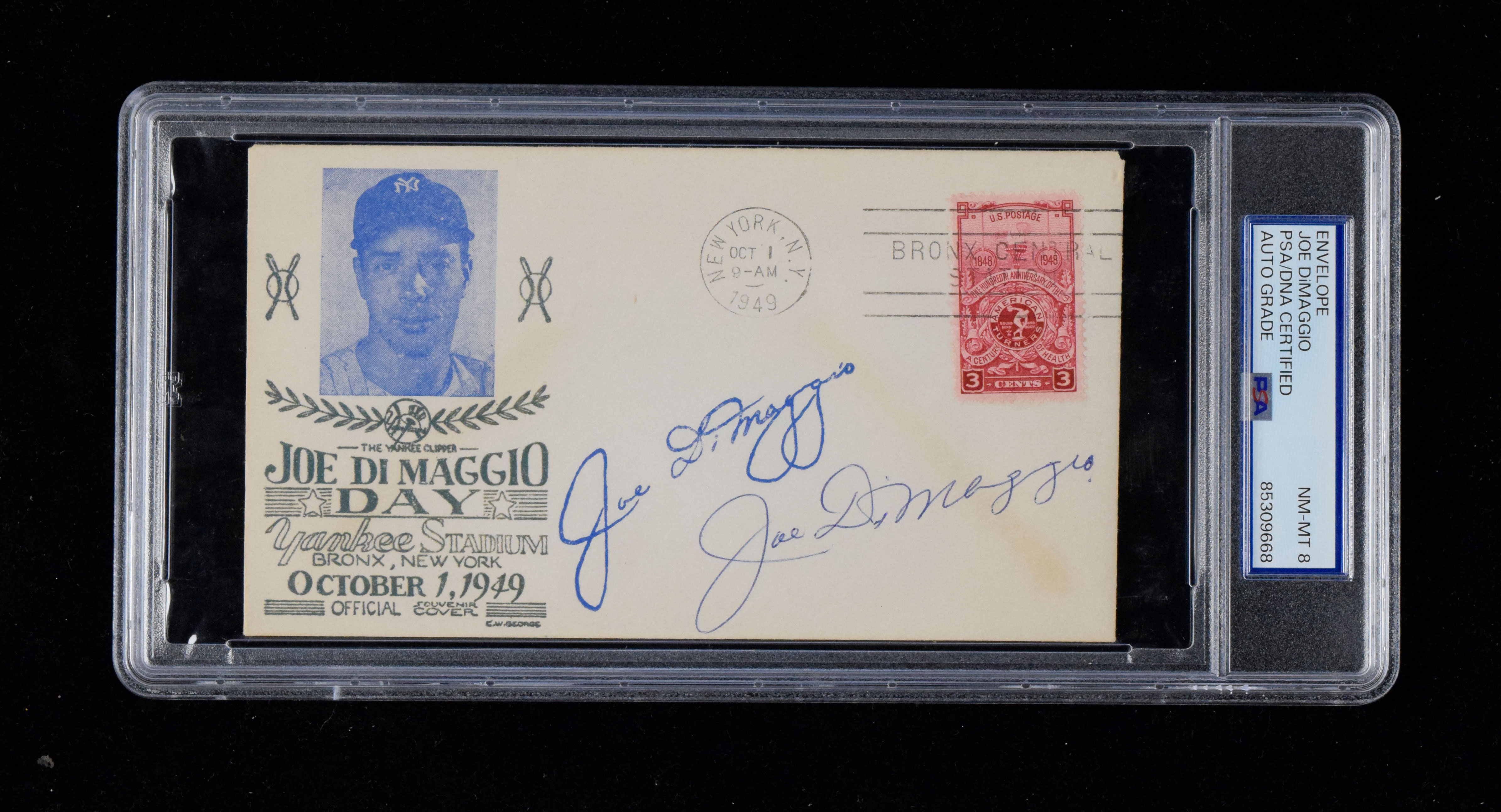 Description:Joe DiMaggio autographed 1949 DiMaggio Day commemorative postal cover (PSA/DNA NM-MT 8) Lightly toned. Signed in ink with the autograph graded by PSA: PSA NM-MT 8
