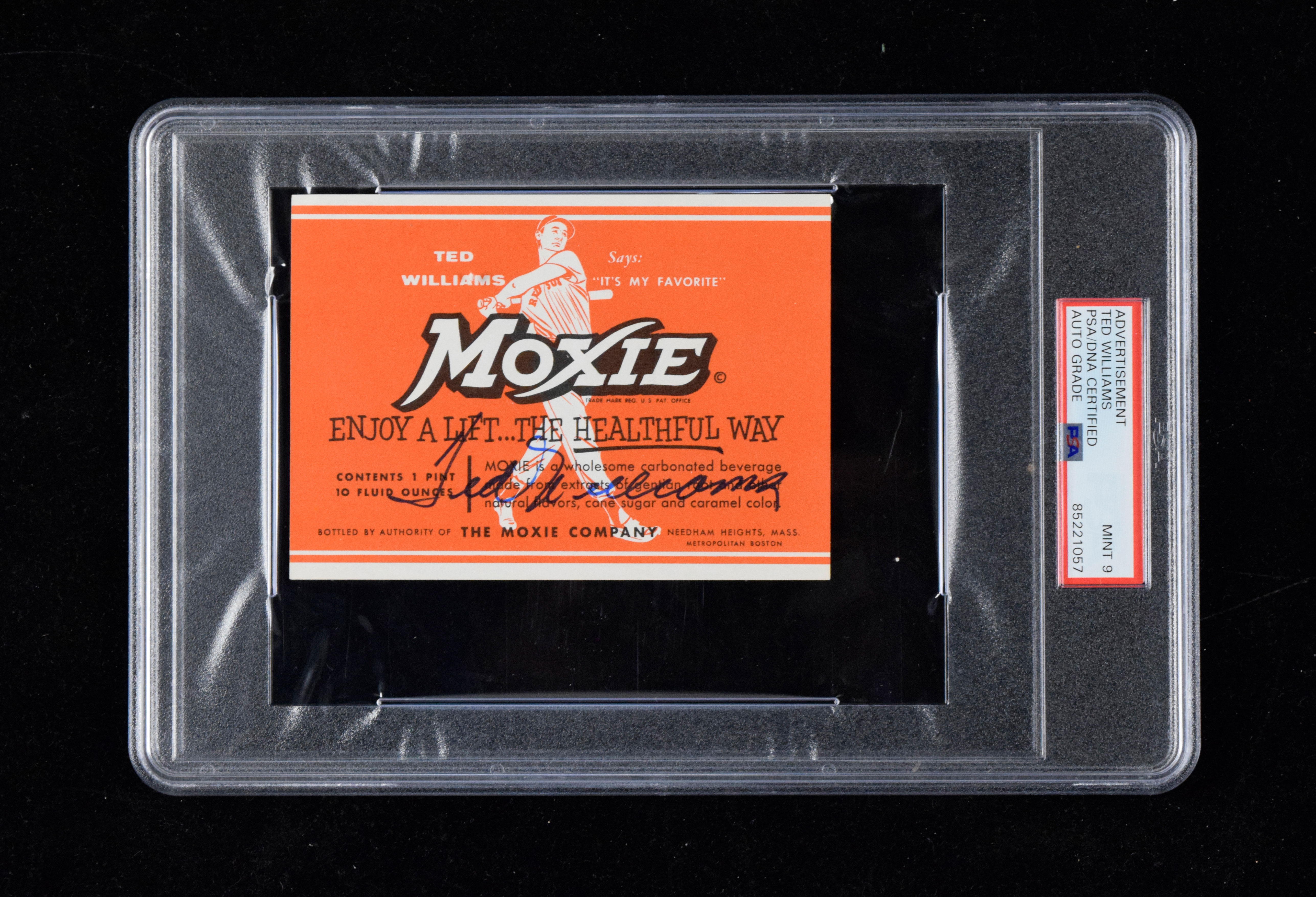 Ted Williams autographed Moxie label (PSA/DNA Mint 9) Signed in marker with the signature graded: PSA Mint 9