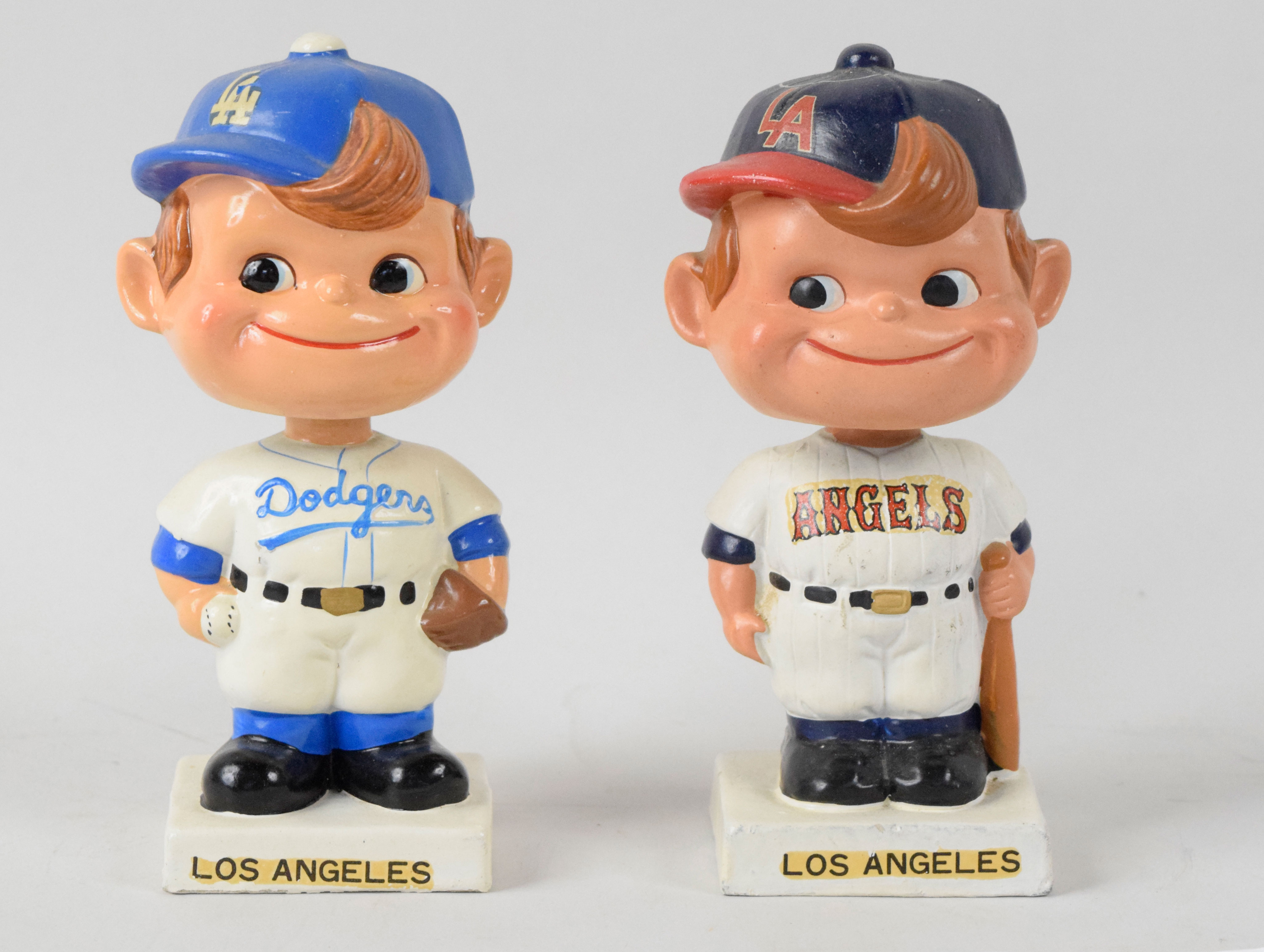 Description:Los Angeles Angels and Los Angeles Dodgers vintage nodders, c.1961-63 (VG-VG/EX). Includes white base Angels nodder (VG light cracks), and white base Dodgers nodder with embossed chest lettering variation (VG/EX minor hairline crack at bottom of head).