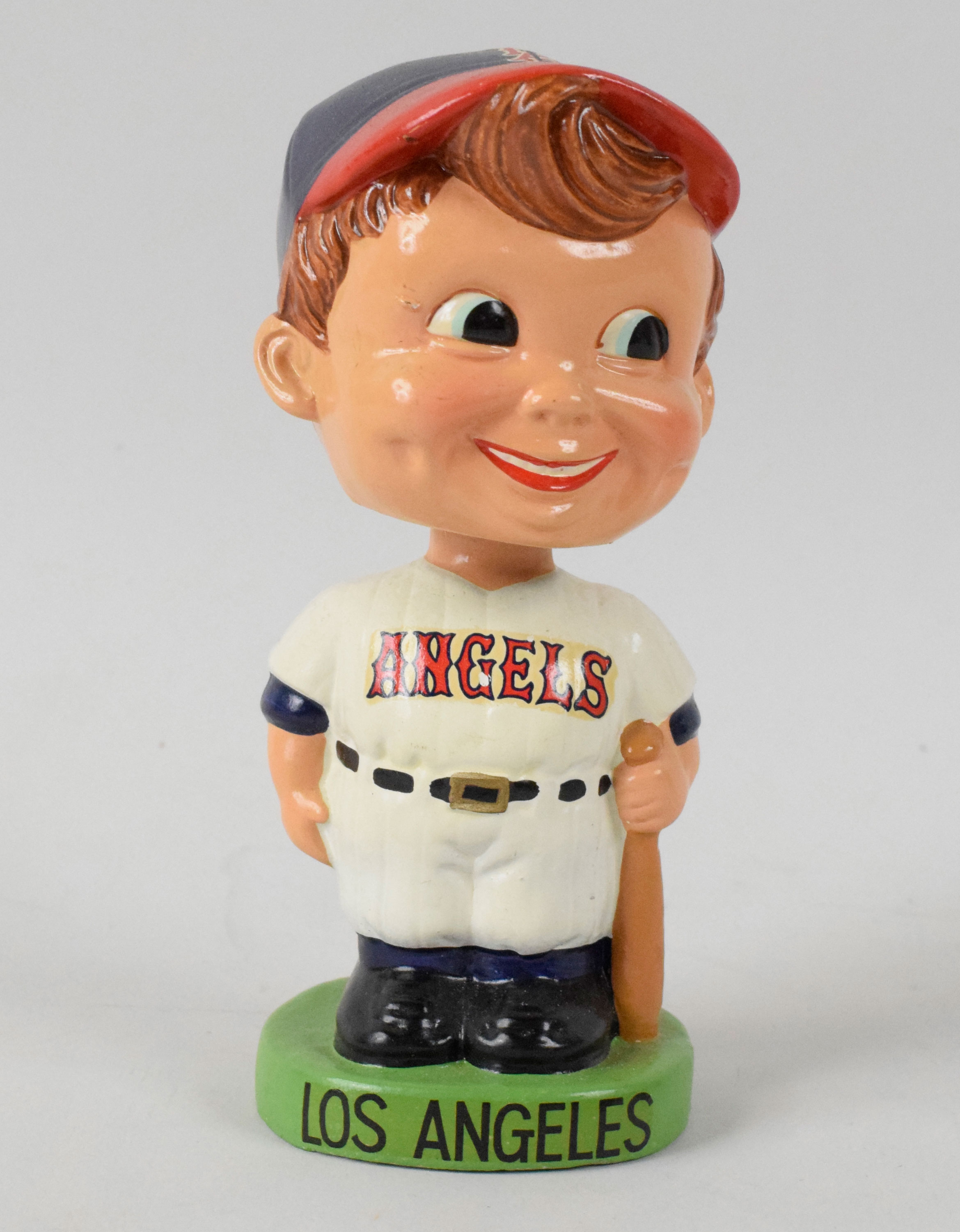 Description:1962 Los Angeles Angels nodder (EX/MT). Green base nodder with teeth showing on smile variation. Minor chest decal chip, with minimal wear otherwise: EX/MT