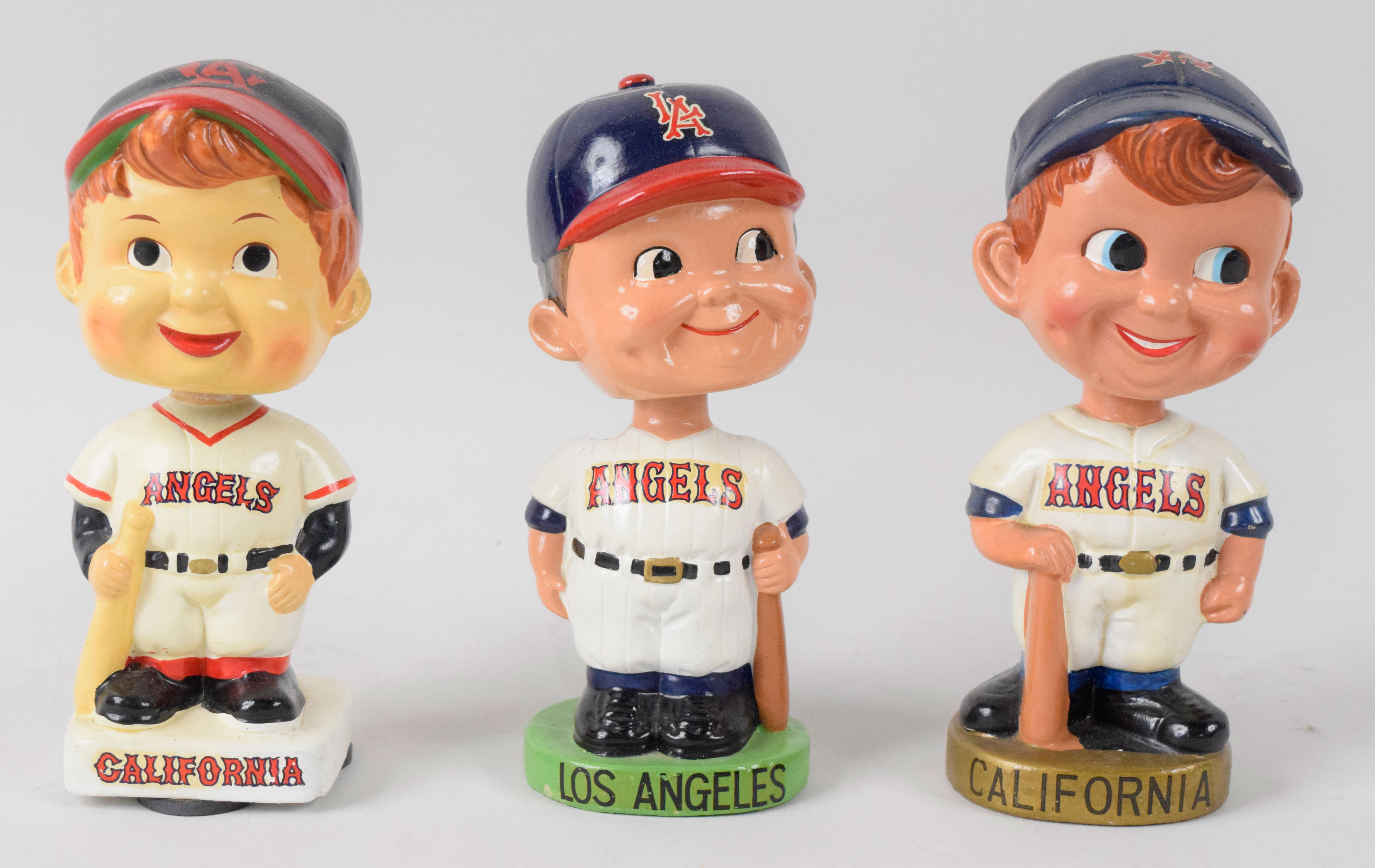 Description:Lot of (3) vintage California and Los Angeles Angels nodders, c.1962-72 (VG-NM). Includes 1962 LA Angels green base nodder without teeth showing on smile variation (VG right shoulder damage), c.1966-71 California Angels gold base nodder (VG/EX-EX small chip on hat brim), and c.1970-72 California Angels white wedge base nodder with magnetic bottom (EX/MT-NM).