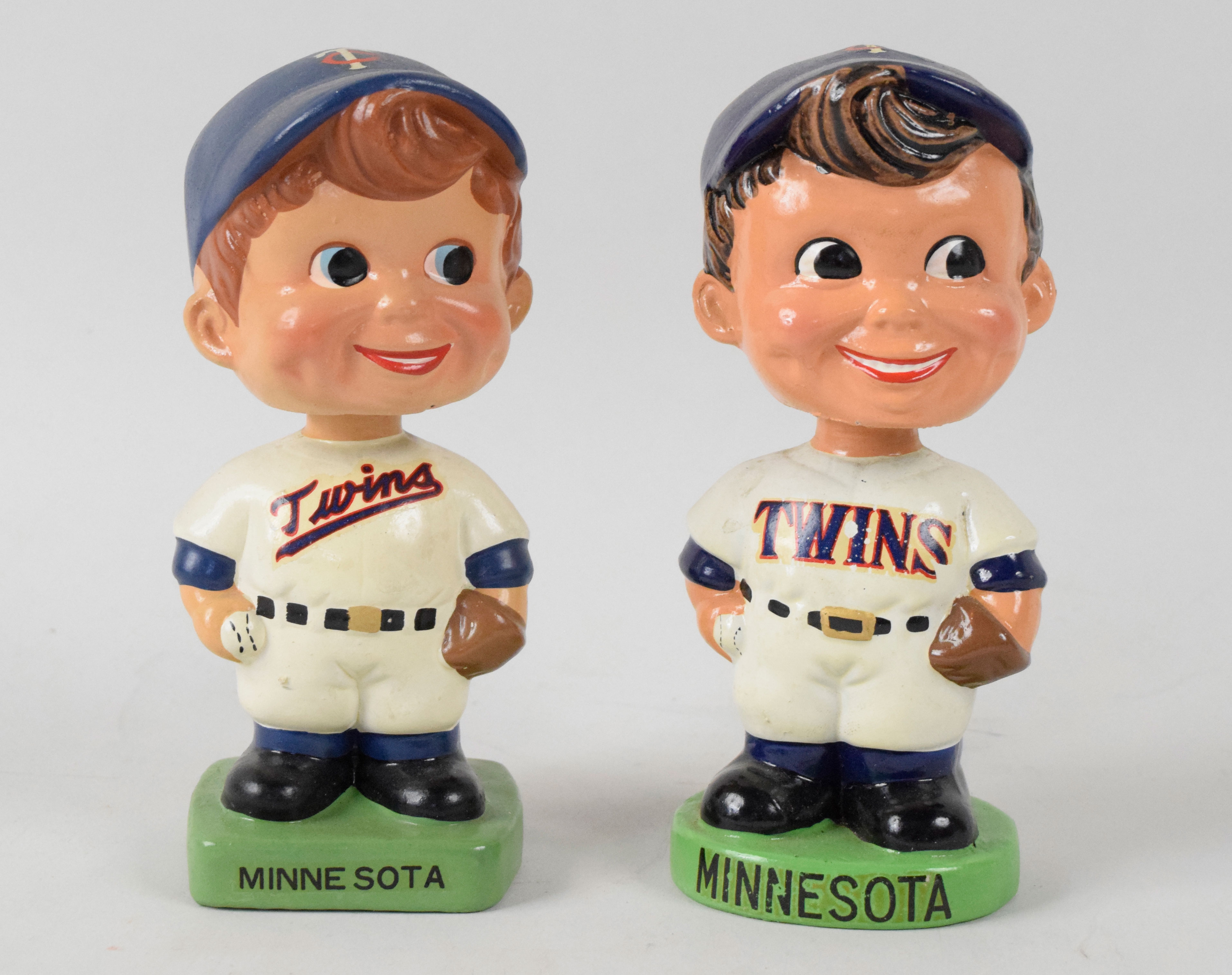 Description:Lot of (2) Minnesota Twins vintage nodders, c.1962-72 (EX-EX/MT). Includes 1962 Twins green base nodder (EX-EX/MT minor decal wear on the chest and some stray paint marks on the back), and c.1970-72 Twins green wedge base nodder (EX/MT very minor chip on back of the head).