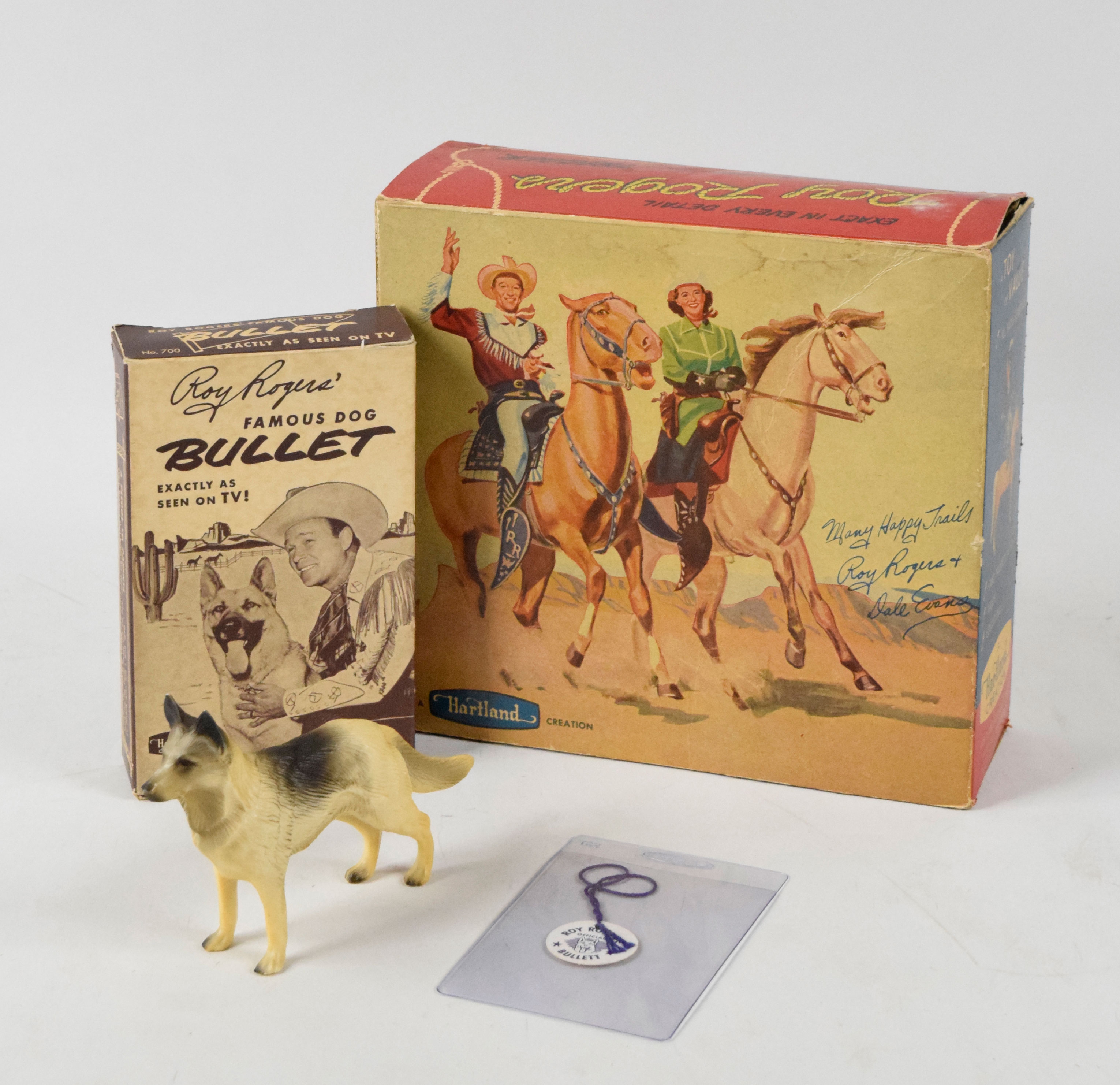 Description:c.1950s-60s Roy Rogers Hartland box with Bullet box, figure, and tag ( Includes original Hartland issued box (GD/VG) which would have held a Roy Rogers figure/horse. Mild wear includes a few wrinkles/creases; original box for a figure of his dog Bullet (EX) with high grade figure inside that has the original hang tag: GD-EX