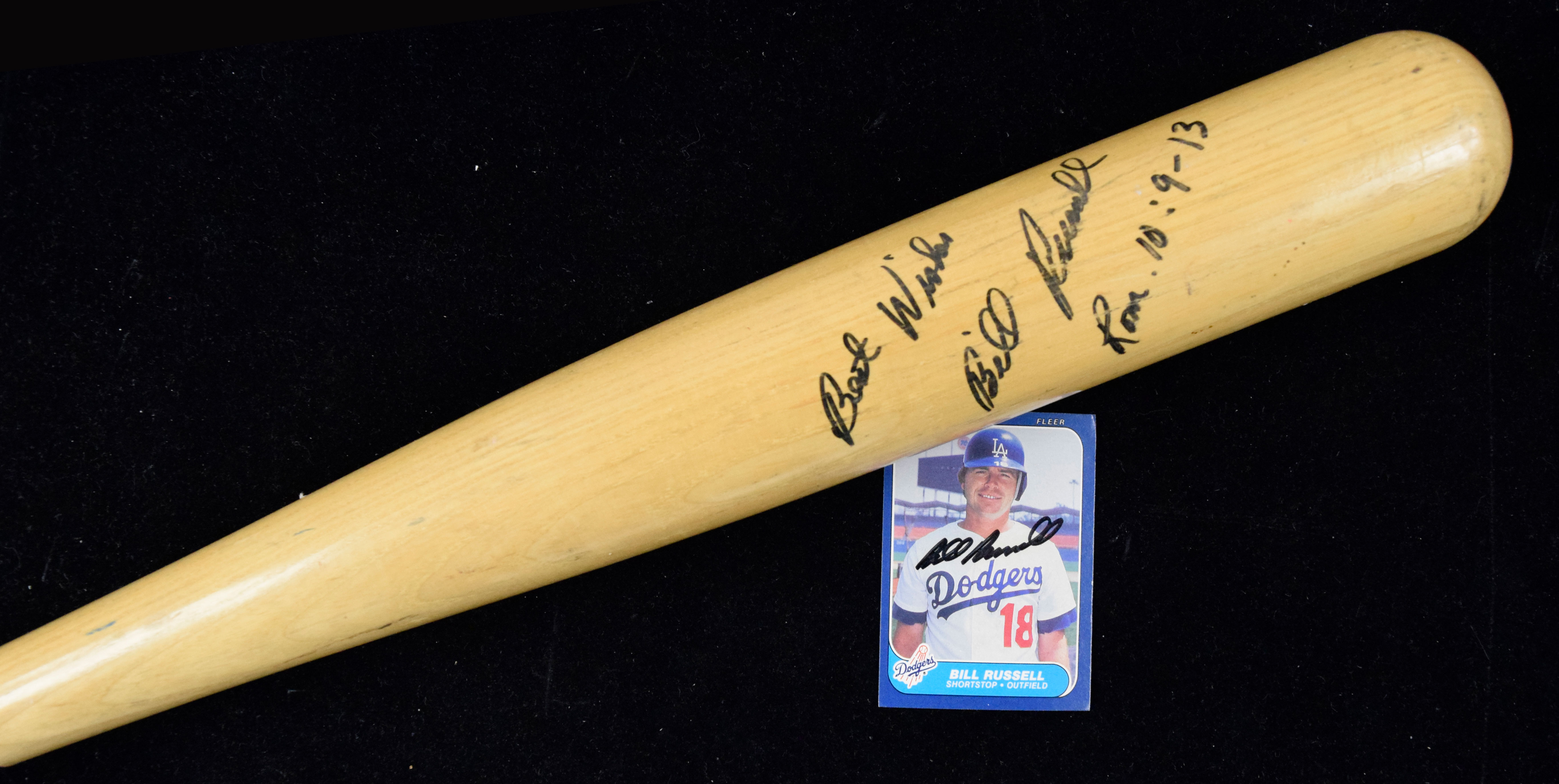 Description:Bill Russell signed professional model baseball bat & signed baseball card (EX-EX/MT). Includes c.1983-86 34" Worth BR 500T Bill Russell model bat with his #18 written on the knob. Russell signed the bat in black marker rating 7 out of 10 (EX light use, tape residue around the knob). Also includes 1986 Fleer #142 signed by Russell in black marker rating 9/10 out of 10: EX-EX/MT