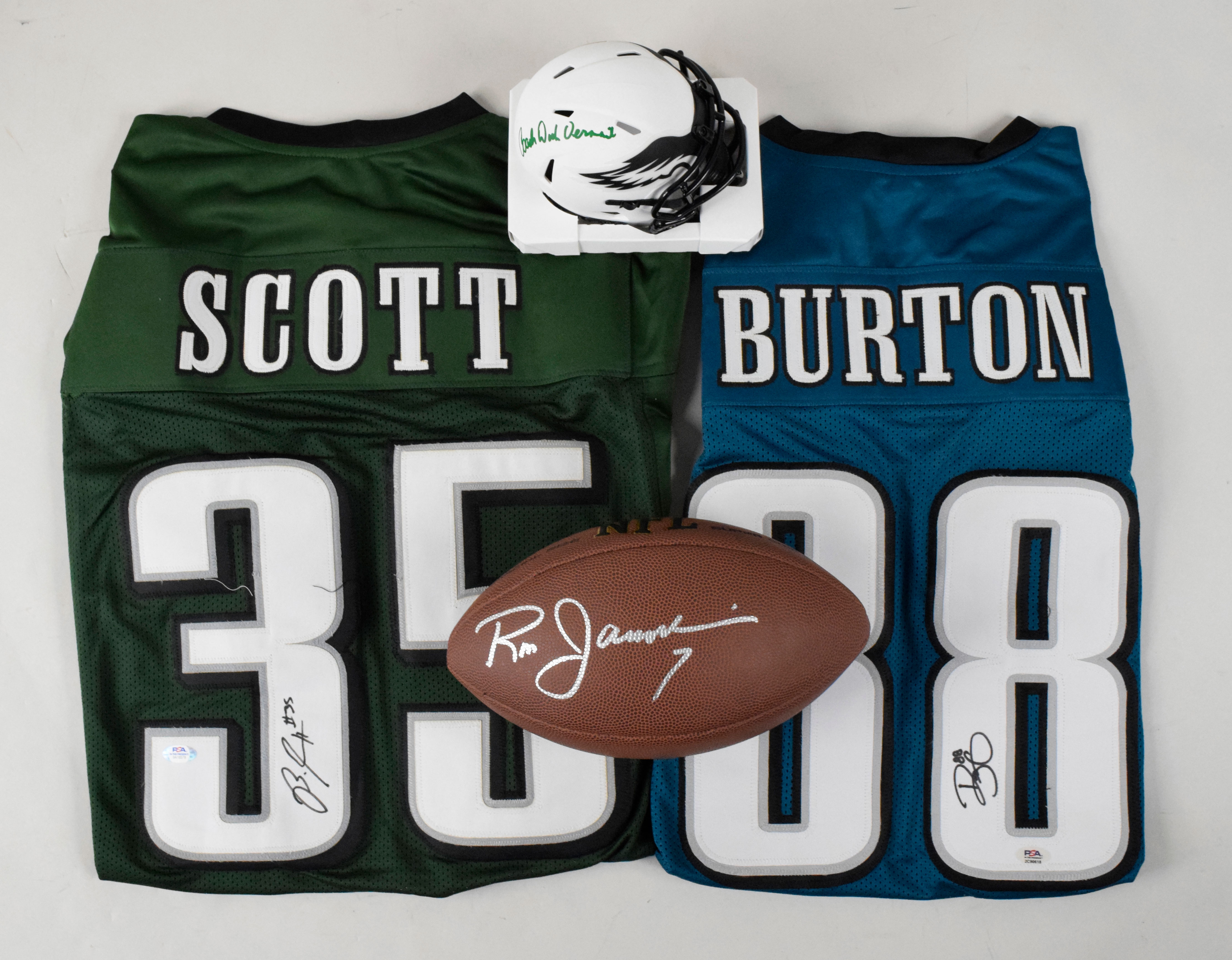 Description:Philadelphia Phillies, Eagles, and Flyers autograph lot (NM-NM/MT overall). Includes an Eagles mini helmet signed by Coach Dick Vermeil (PSA); Wilson NFL Super Grip football signed by Ron Jaworski (PSA); #88 Trey Burton jersey signed by Burton (PSA); #35 Boston Scott jersey signed by Scott (PSA); and (6) signed 8"x10" photos: Art Mahaffey, Marlon Byrd, Brian Propp, Stefen Wisniewski, Avonte Maddox, and dual-signed Najee Goode / Dannell Ellerbe. Signatures rate 8 to 10 out of 10. Also includes an unsigned size L #16 Norm Snead jersey: NM-NM/MT overall