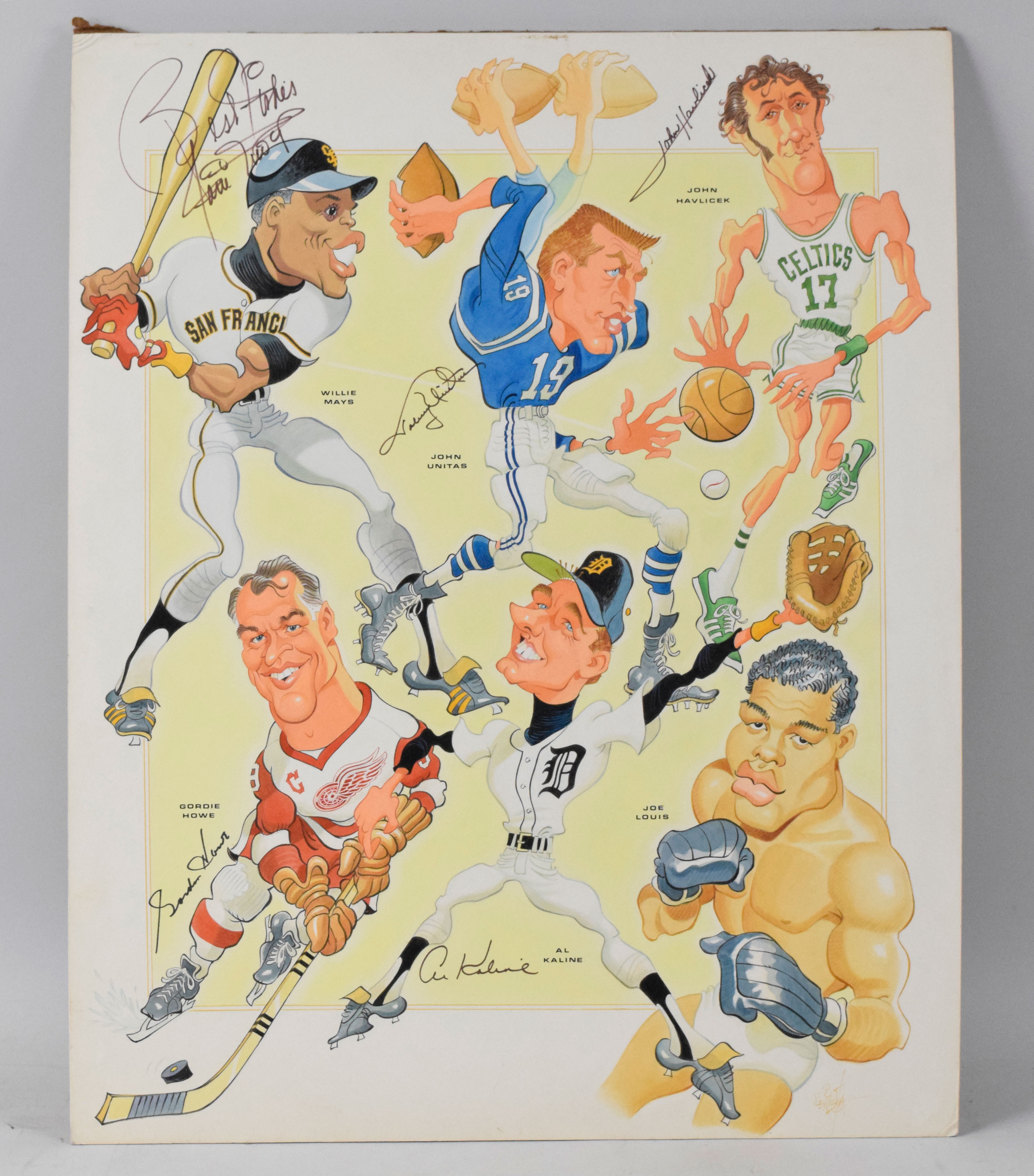 Description:Willie Mays, John Havlicek, Johnny Unitas, Gordie Howe, Al Kaline multi-signed artwork also signed by artist Bob Bentovoja (EX/MT). Approx. 23"x29" original caricature illustration signed by Willie Mays, John Havlicek, Johnny Unitas, Gordie Howe, and Al Kaline. Signatures rate 8/9 to 10 out of 10. Also signed by Bob Bentovoja at the bottom right corner. Edge and corner wear which could likely be matted out of view if framed: EX/MT
