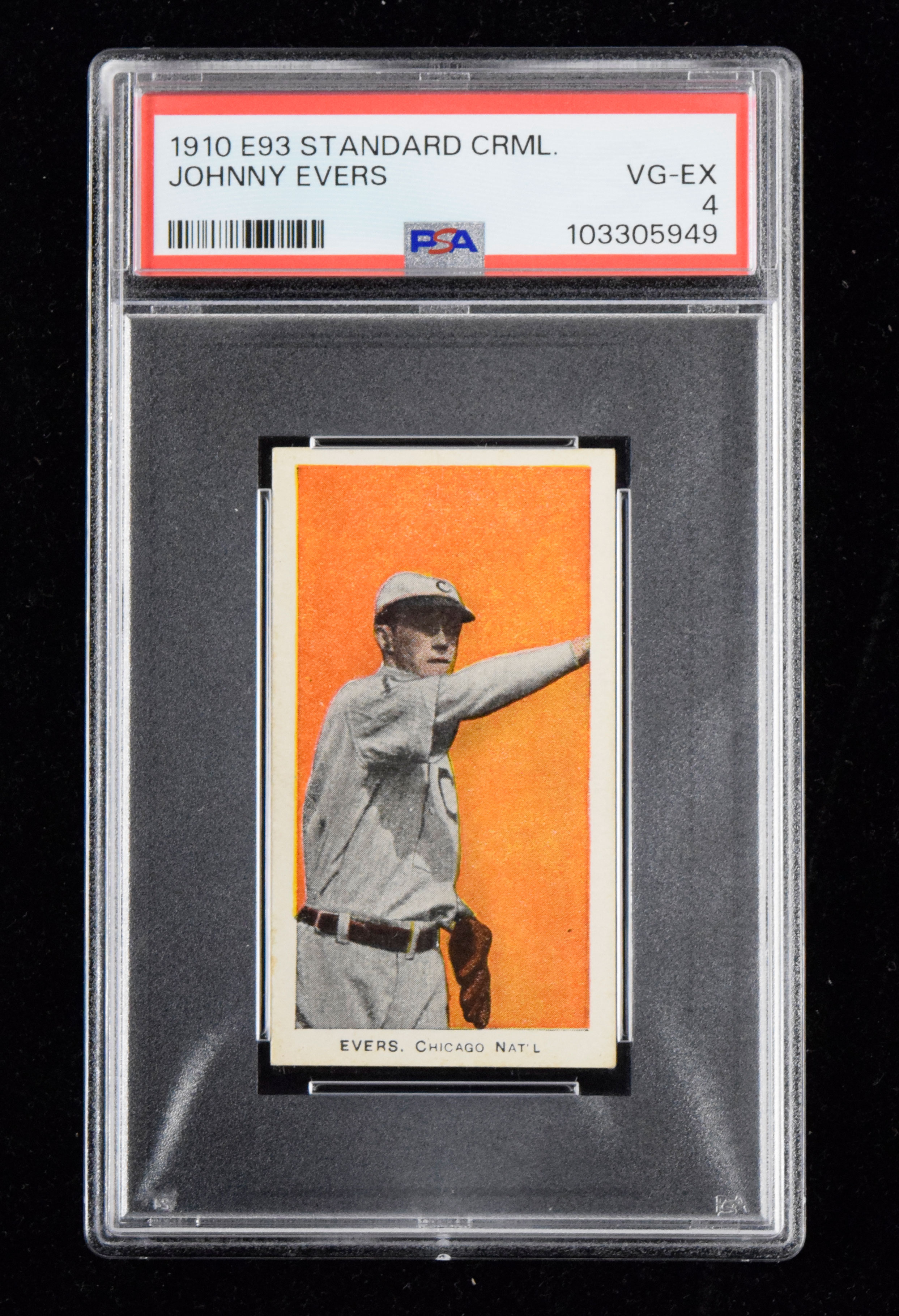 1910 E93 Standard Caramel Johnny Evers - outstanding eye appeal for grade (PSA VG-EX 4) Well centered with crisp image. Light wear primarily effecting lower left edge: PSA VG-EX 4 ($750-$1,000)