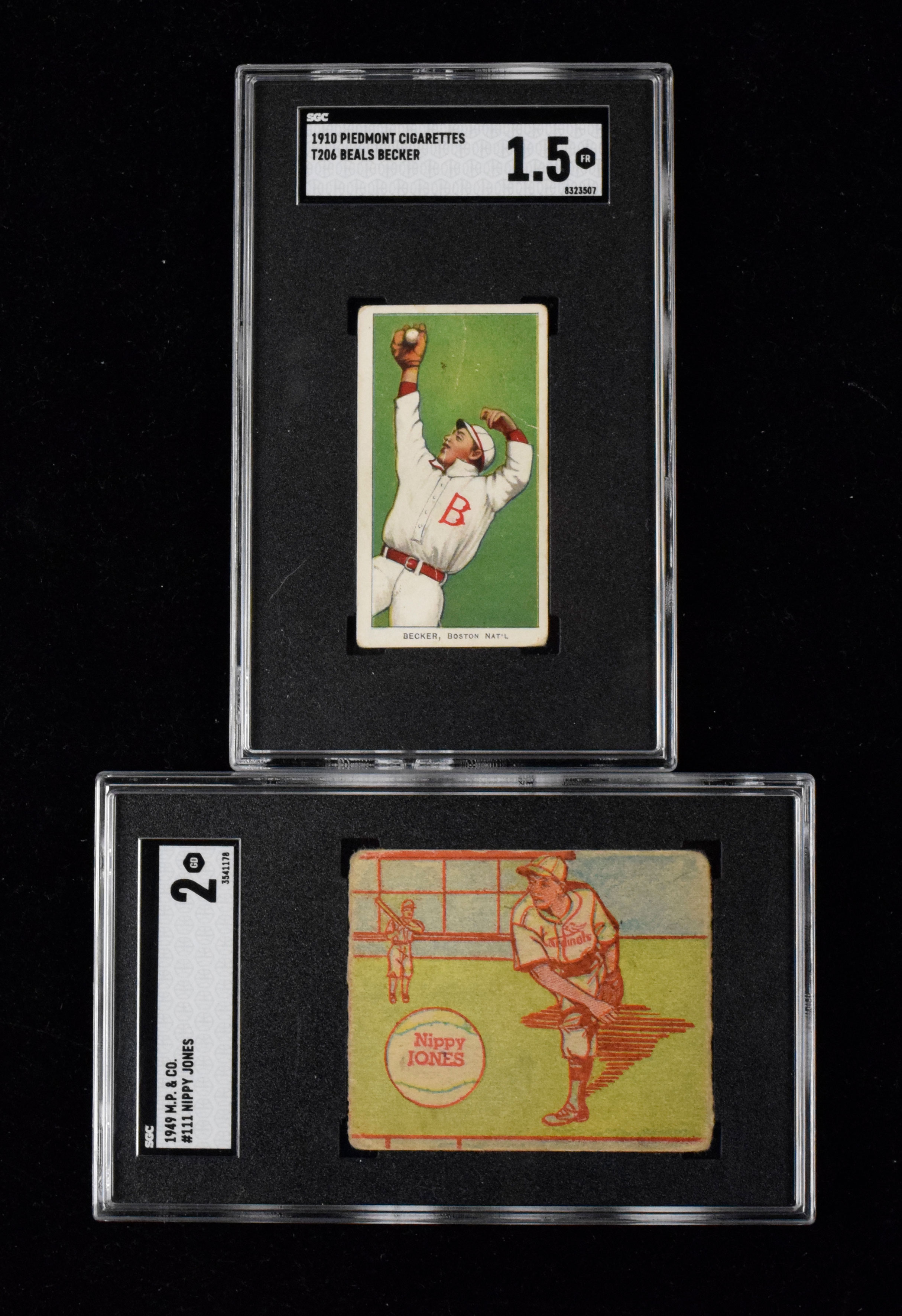 T206 Beals Becker, 1949 M.P. & Co. Nippy Jones, (10) 1954 Bowman U.S. Navy Victories cards, (34) 1959 Fleer "Plains Indians" (PR-EX/MT). Includes T206 Beals Becker with Piedmont back (SGC 1.5 FR); 1949 M.P. & Co. #111 Nippy Jones (SGC 2 GD); 1954 Bowman U.S. Navy Victories #s 7, 11, 12, 23, 34, 35, 36, 37, 41, and 44 (very PR - FR/GD); 1959 Fleer "Plains Indians" #s 1, 2, 3, 7, 15, 16, 17, 21, 23, 27, 28, 29, 30, 33, 38, 40, 45, 50, 51, 52, 53, 55, 56, 58, 60, 62, 63, 65, 70, 72, 73, 74, 75, and 78 (VG-EX/MT, avg VG/EX-EX overall). Range: PR-EX/MT
