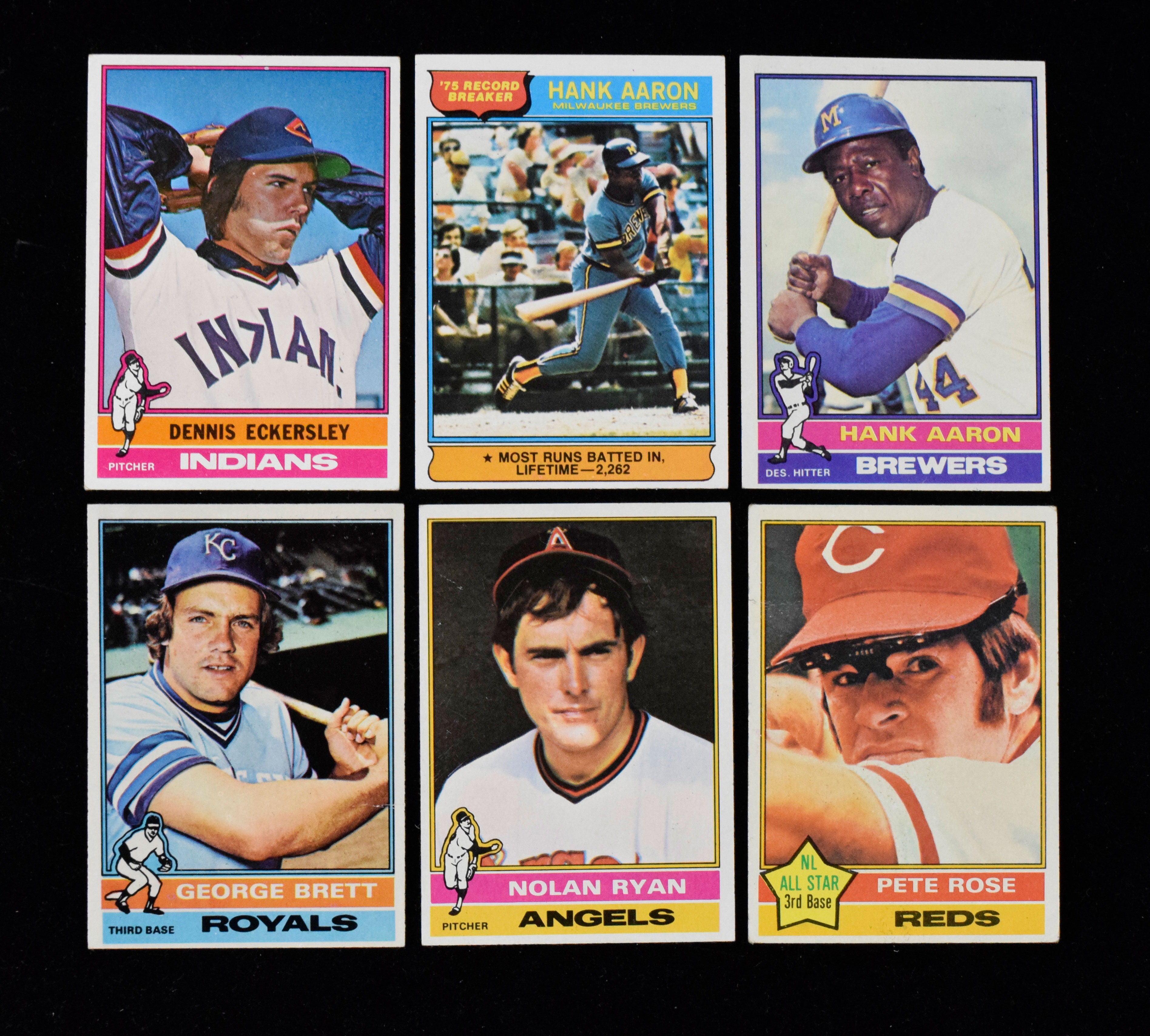 Description:1976 Topps Baseball card set (VG-NM). Key cards grade: #s 1 Hank Aaron (EX/MT oc), 19 George Brett (VG), 98 Dennis Eckersley rookie (EX-EX/MT), 240 Pete Rose (VG), 330 Nolan Ryan (NM front but wax stain on back), 550 Hank Aaron (EX/MT miscut). Remainder appear to average EX-EX/MT overall. Range: VG-NM