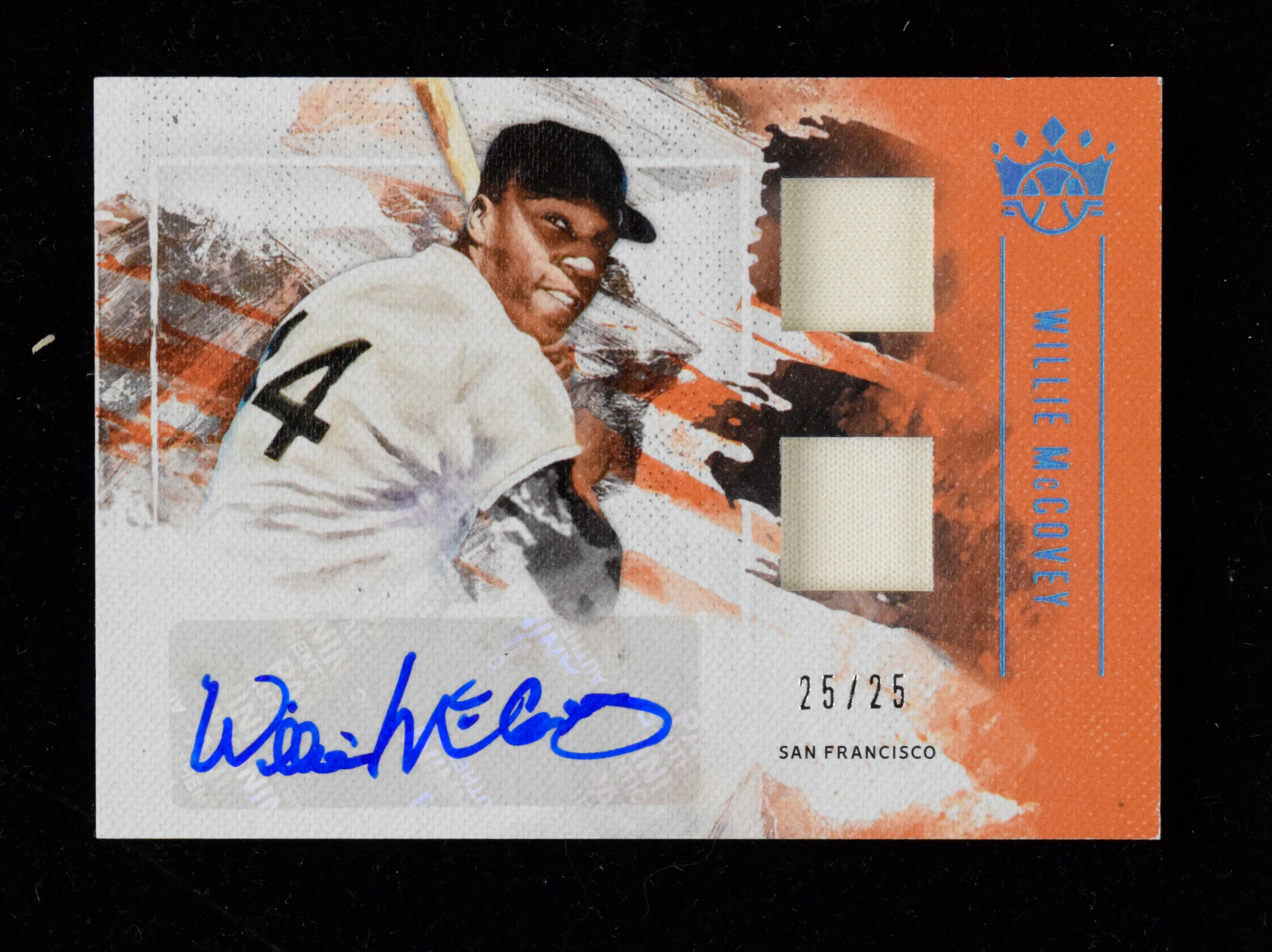 Description:Willie McCovey signed 2019 Panini Diamond Kings relic insert card serial #ed 25/25 (NM). 2019 Panini Diamond Kings "DK Material Signatures Holo Blue" #DMS-WM signed by McCovey in blue marker. Signature rates 9/10 out of 10. The card is numbered 25/25: NM