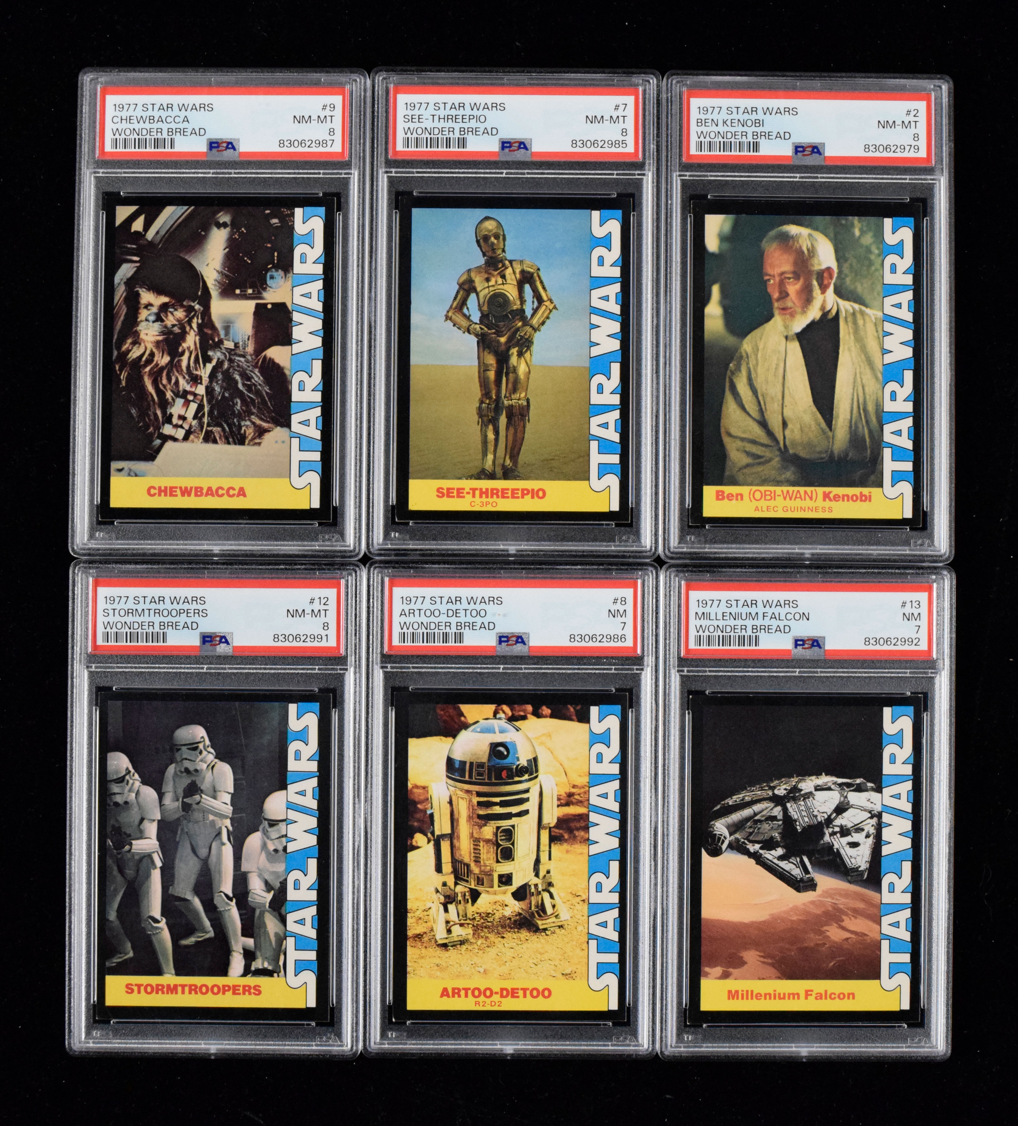 Lot of (12) 1977 Wonder Bread graded Star Wars cards (NM-NM/MT). Includes #s 2 Obi-Wan Kenobi (PSA 8 NM/MT), 6 Tarkin (PSA 7 NM), 7 See-Threepio (PSA 8 NM/MT), 8 Artoo-Detoo (PSA 7 NM), 9 Chewbacca (PSA 8 NM/MT), 10 Jawas (PSA 7 NM), 11 Tusken Raiders (PSA 7 NM), 12 Stormtroopers (PSA 8 NM/MT), 13 Millenium Falcon (PSA 7 NM), 14 Star Destroyer (PSA 7 NM), 15 X-Wing (PSA 7 NM), and 16 Vader's Ship (PSA 7 NM).