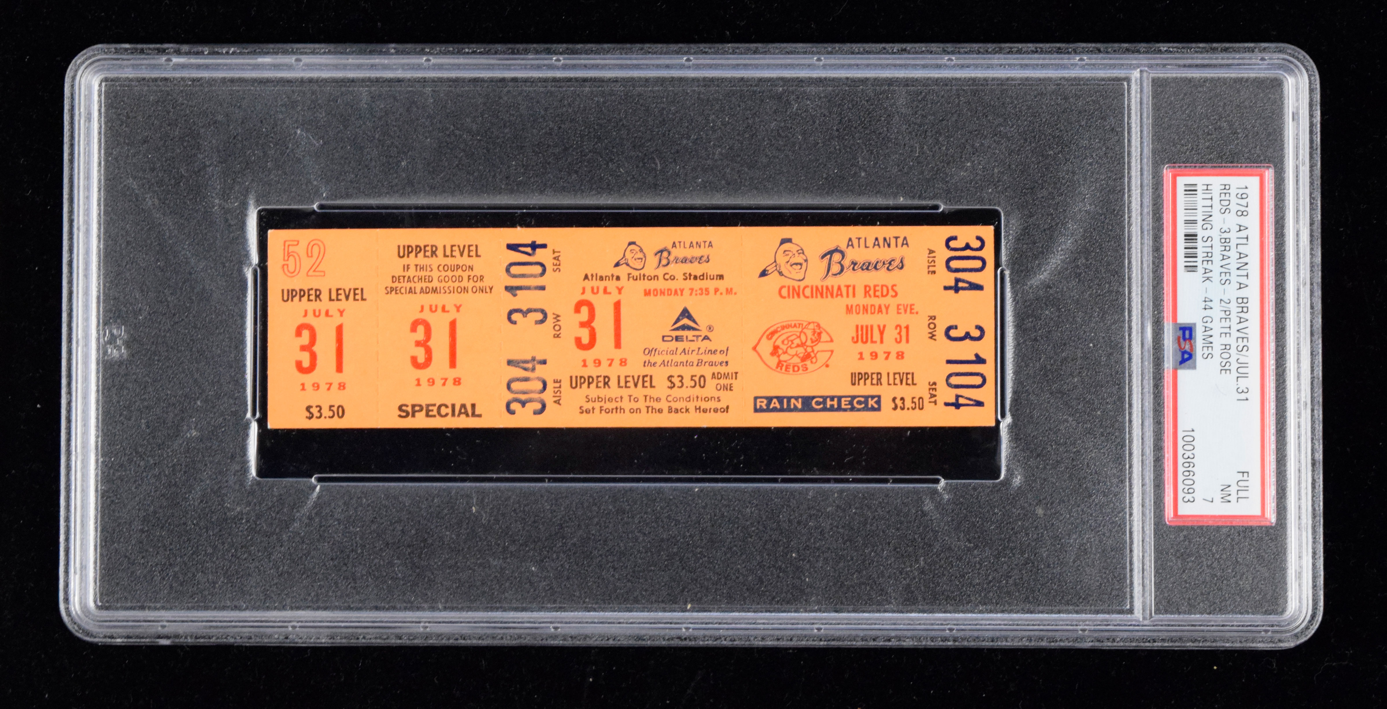 Description:July 31, 1978 Pete Rose (44) game hitting streak full ticket - ties Willie Keeler's National League record (PSA NM 7) High grade full unused ticket issued for the Reds vs. Braves game in which Rose tied Willie Keeler's National League record. In outstanding condition with no mentionable wear: PSA NM 7 ($500-$1,000)