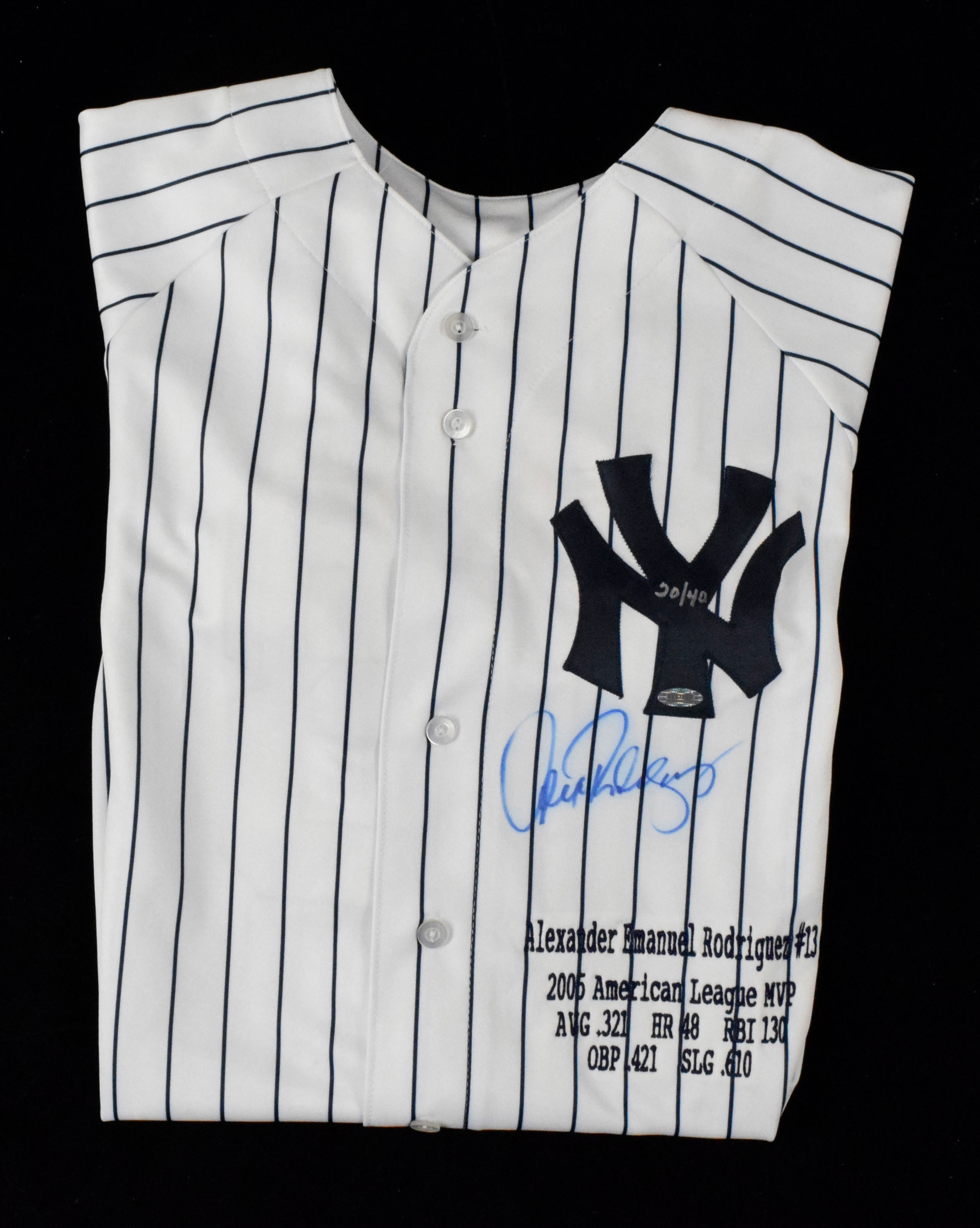 Description:Alex Rodriguez signed New York Yankees limited edition 2005 MVP jersey - Steiner (NM). Majestic size XL Yankees #13 Alex Rodriguez jersey with 2005 AL MVP embroidery. Rodriguez signed the jersey in blue marker. Signature rates 8 out of 10. Includes COA from Steiner (hologram sticker is on the jersey). Numbered 20/40: NM