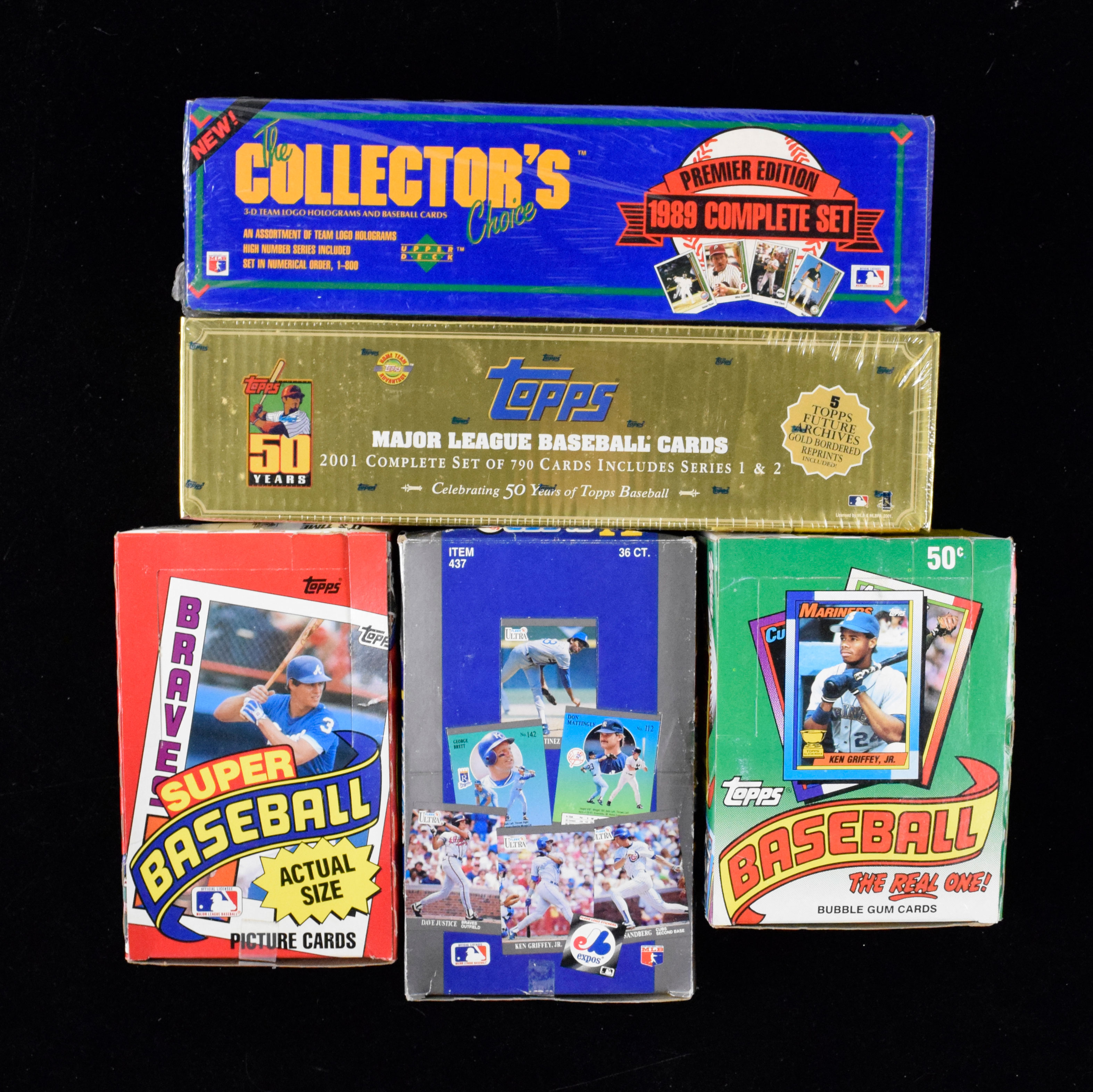 Lot of unopened sports & non-sports packs & sets from 1984-2001 including 1989 Upper Deck set (NM-NM/MT overall). Includes 1984 Topps Super 5x7s baseball wax box, 1989 Upper Deck baseball factory set, 1990 Topps Baseball wax box, 1991 Fleer Ultra baseball wax box, 1991-92 Topps Stadium Club hockey wax box, 1992-93 Topps Stadium Club hockey series 1 wax box, 1992-93 Collect-A-Card Harley Davidson series 1 wax box, 1992-93 Collect-A-Card Harley Davidson series 2 wax box, and 2001 Topps Baseball factory set: NM-NM/MT overall