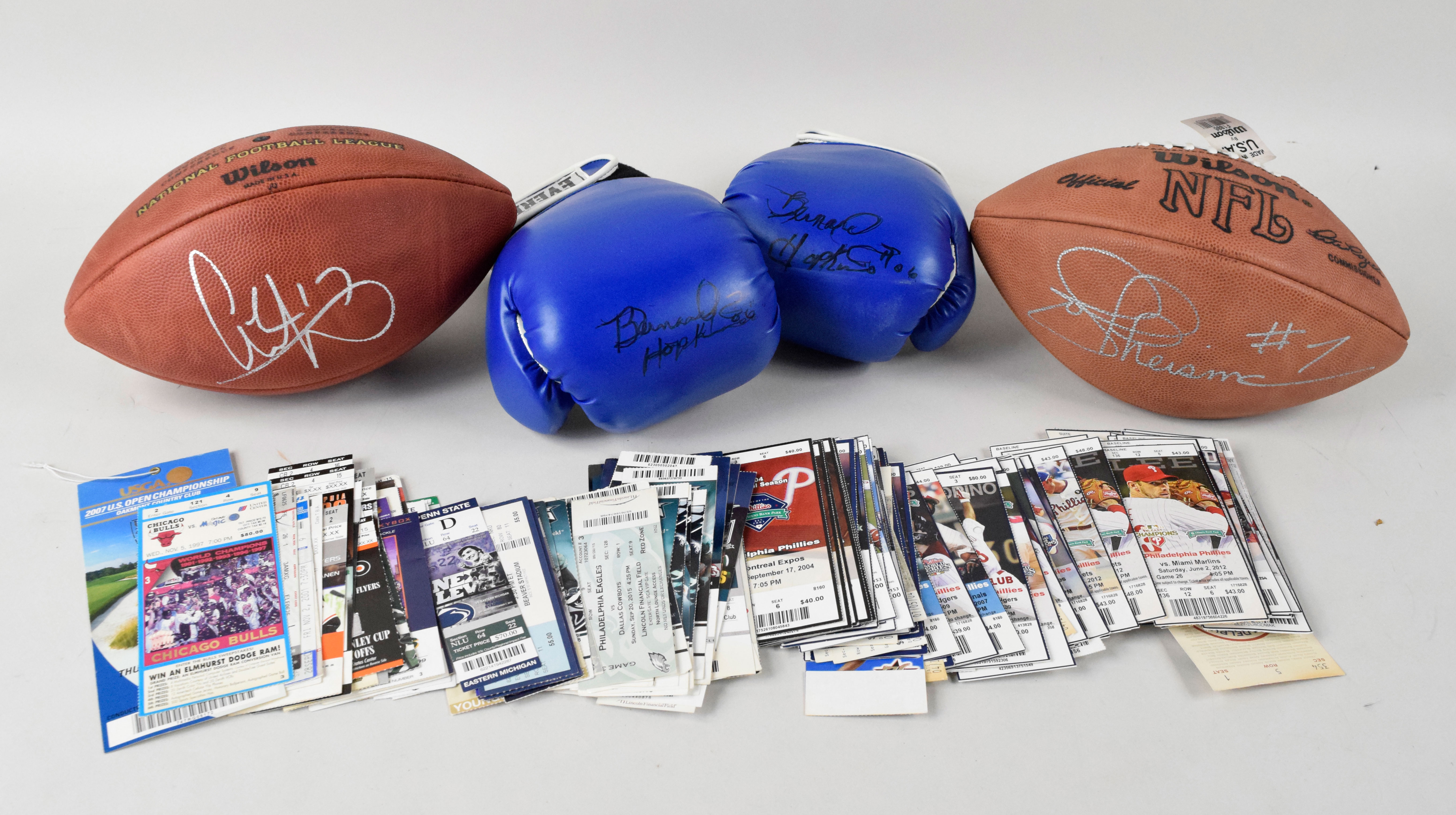 Description:Lot of assorted sports memorabilia, tickets, and autographs (GD-NM/MT). Autographs include a pair of Everlast boxing gloves both signed by Bernard Hopkins, P.Rozelle NFL football signed by Joe Theismann, and R.Goodell NFL football signed by Alshon Jeffery. Signatures rate 8 to 9/10 out of 10. Also includes 11/5/1997 Orlando Magic at Chicago Bulls ticket stub (VG, Michael Jordan 29 points and 17 rebounds); 1998 NLCS Game 6 ticket stub (VG); 1999 World Series Game 2 ticket stub (VG/EX); (109) Philadelphia Phillies tickets from 2003-2018 (GD-NM, avg VG/EX overall); (19) Philadelphia Eagles tickets from 2004-2016 (GD-NM, avg VG/EX overall); (15) Penn State football tickets from 2005-2015 (GD-NM, avg VG/EX overall); Super Bowl XXXIX football (NM); Pair of unused boxing gloves, and numerous other tickets from various sports: GD-NM/MT