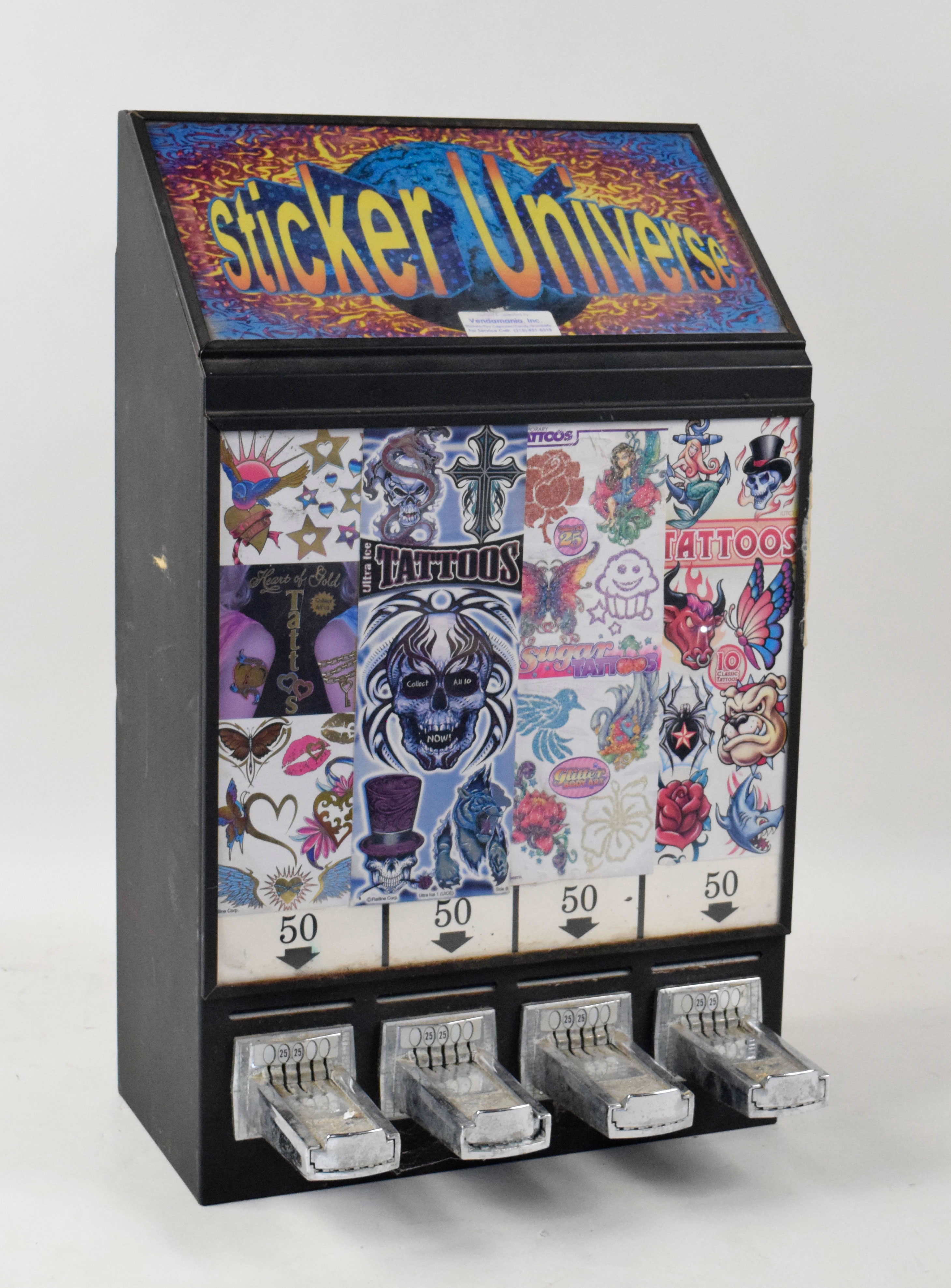 Description:"Sticker Universe" vending machine (EX/MT). Vendamania Inc. vending machine used to obtain stickers at 50-cents each. Scattered surface wear along with a white residue along a portion of one edge (keys not present): EX