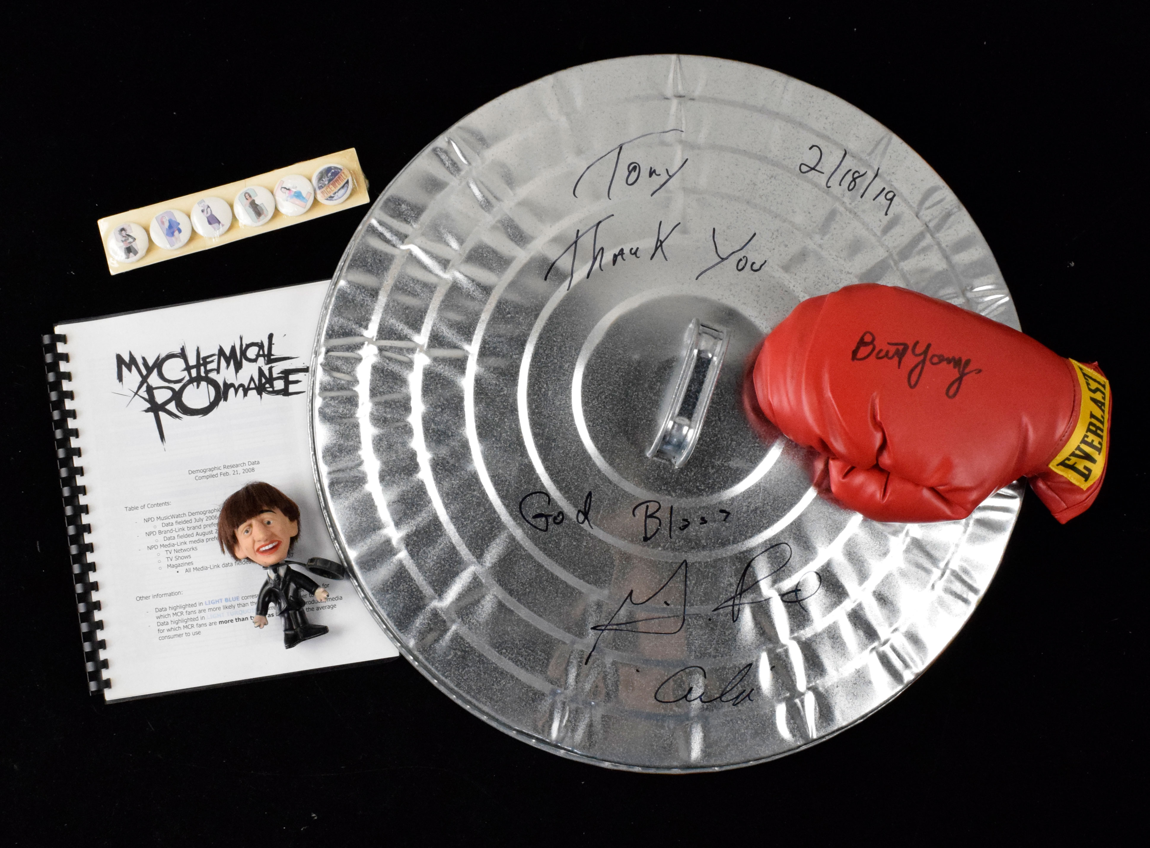 Description:Lot of assorted memorabilia mostly music and entertainment related (VG-NM/MT). Includes 1964 Ringo Starr 4.5" figurine by Seltaeb Inc., comic books from the late 1960s - early 1970s (off condition), 1975 O.J. Simpson "Super Pro" action figure by Shindana Toys in original package (wear around the exterior of the box), Everlast boxing training glove signed by Burt Young, large metal garbage can lid signed by Gianni Russo with "Carlo" inscription (personalized to Tony), set of (6) 1997 Spice Girls pins (unopened), 2008 My Chemical Romance demographic research data booklet, Coldplay messenger bag, posters, souvenirs, display pieces, and other items. Various conditions throughout the lot. Most pieces appear to average EX-EX/MT overall (other than comics). Range: VG-NM/MT