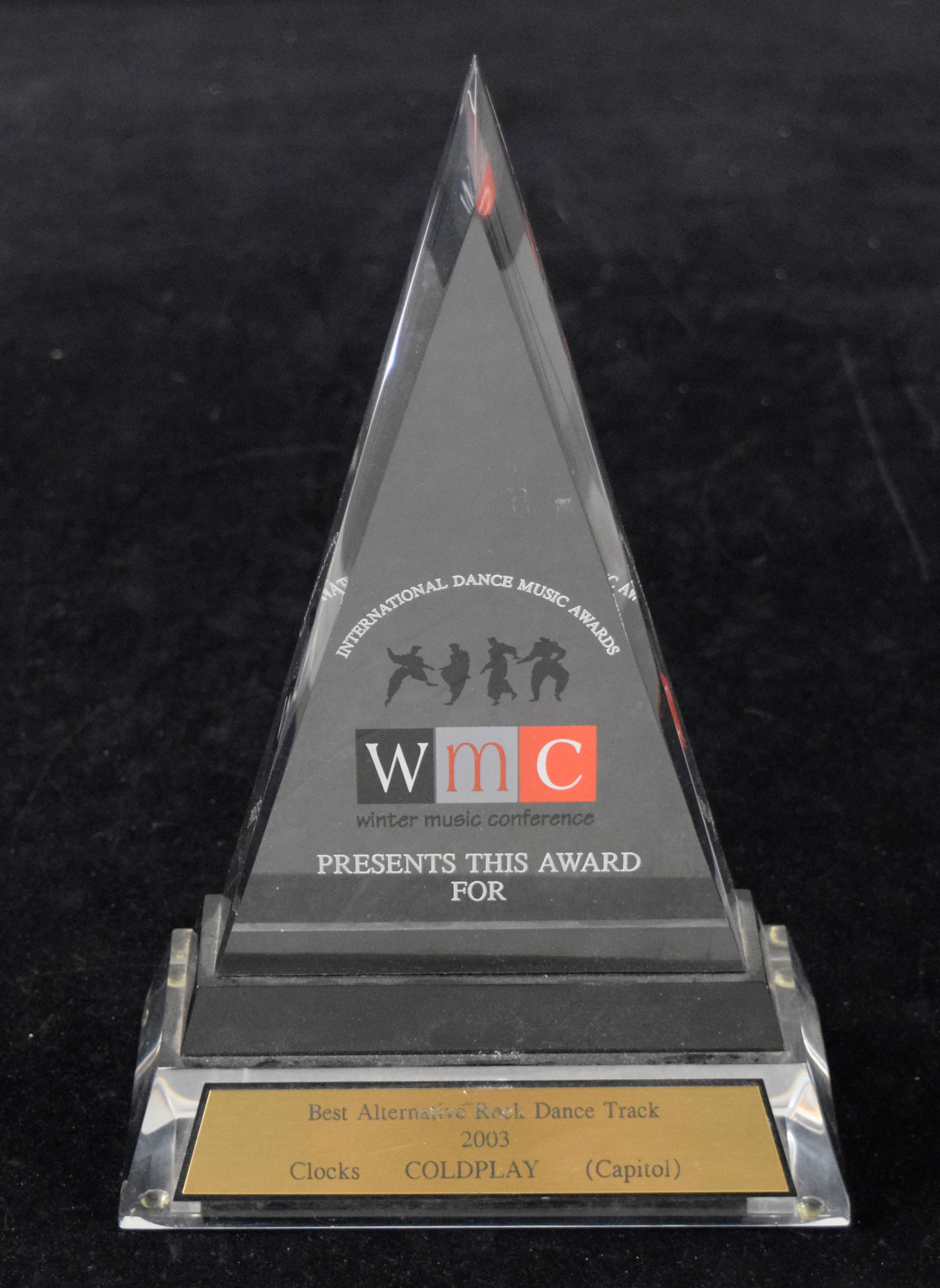 Description:Coldplay 2003 WMC Best Alternative Rock Dance Track award (EX/MT). Approx. 7"x11" triangular award presented to Coldplay at the Winter Music Conference's International Dance Music Awards for their Clocks dance track. Minor scratches on the placard: EX/MT