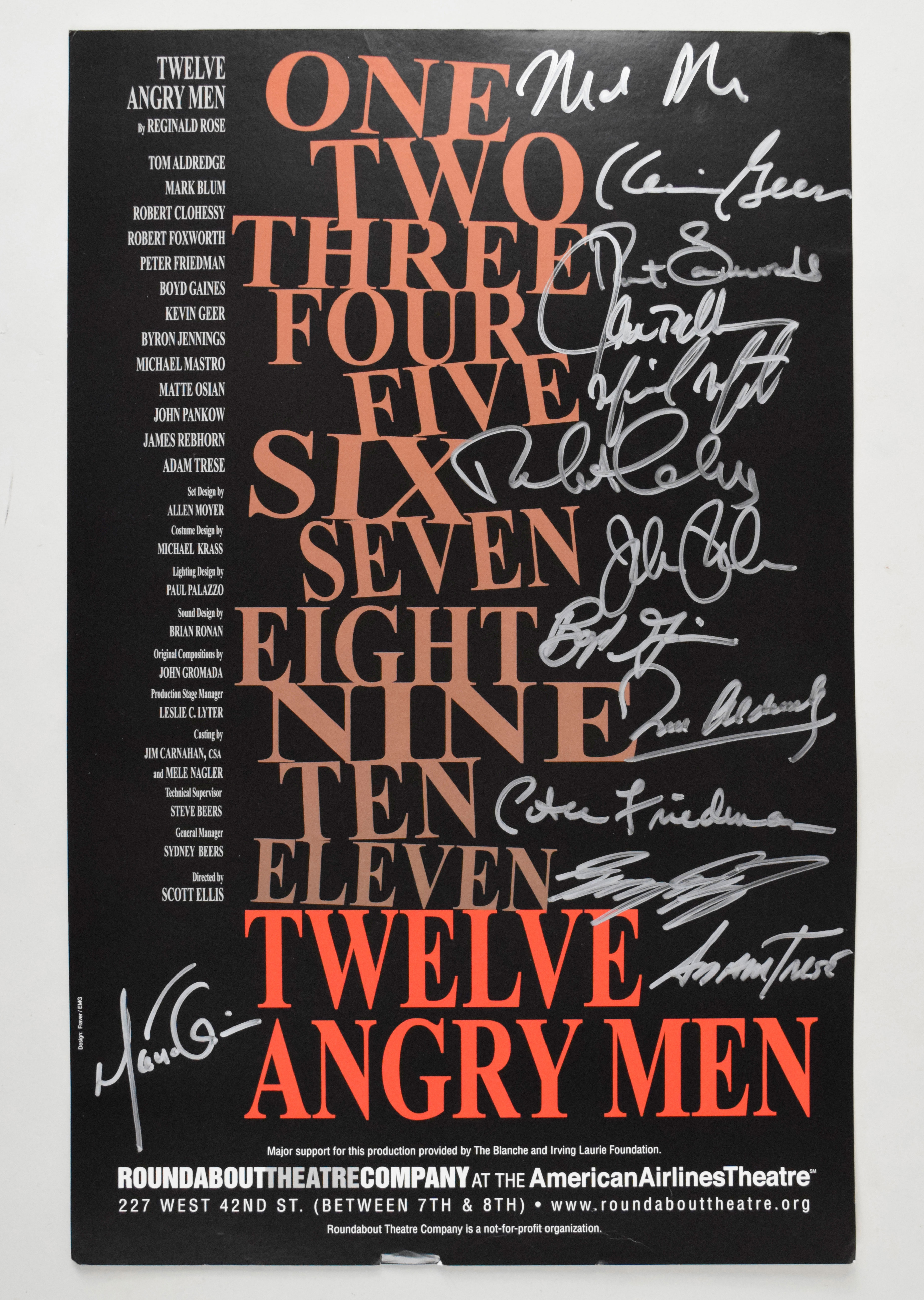 Description:2004 "Twelve Angry Men" Broadway cast multi-signed poster (EX/MT). 14"x22" thin cardboard poster signed by (13) including Tom Aldredge, Mark Blum, Robert Clohessy, Peter Friedman, John Pankow, Robert Foxworth, Boyd Gaines, Kevin Geer, Michael Mastro, James Rebhorn, Byron Jennings, Matt Osian, and Adam Trrese. Signatures rate 7 to 10 (avg 8) out of 10: EX/MT