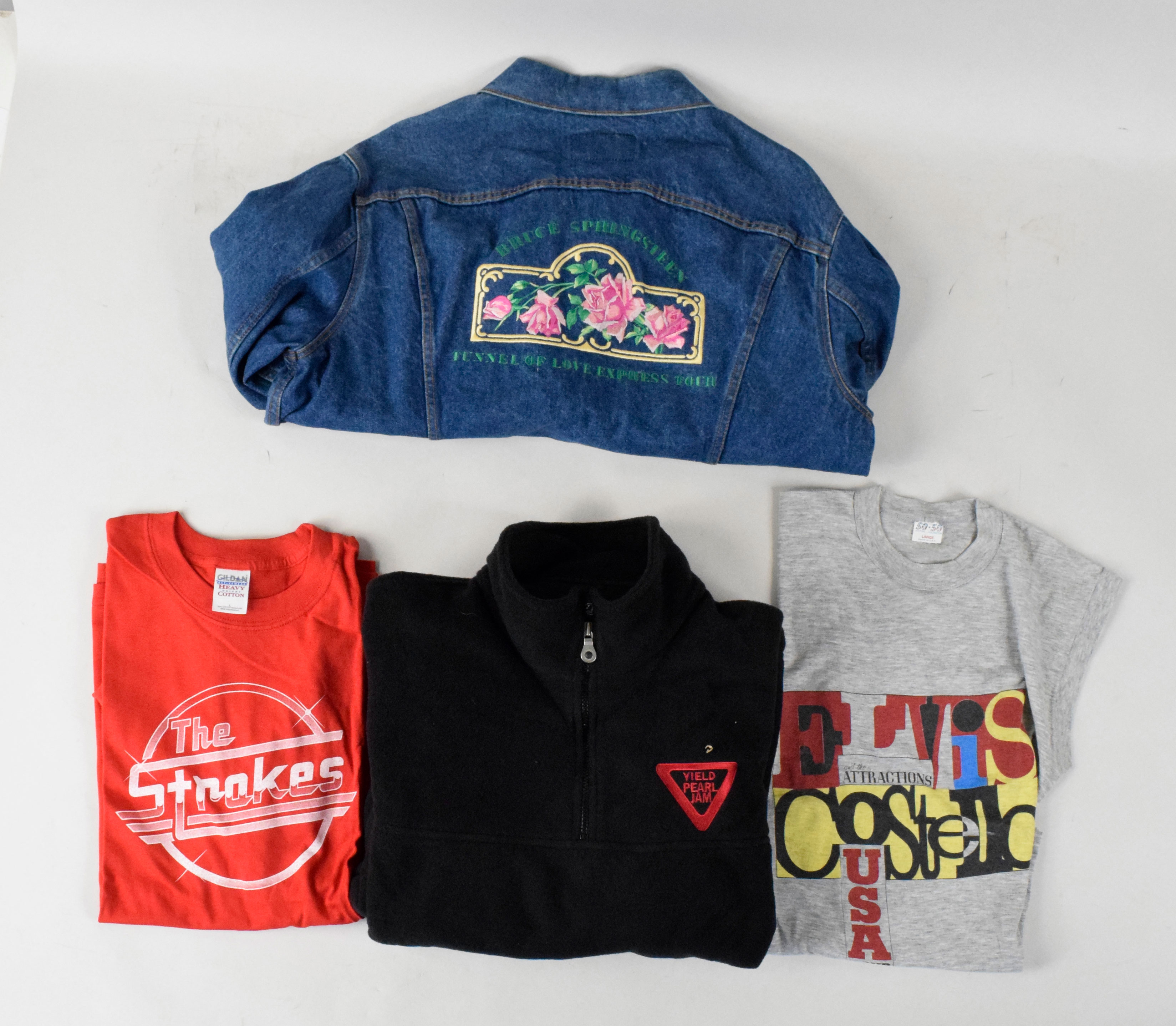Description:Very nice lot of mostly music related apparel (EX-NM/MT). Jackets include New York Knicks by Starter (staining around inner collar), New York Yankees 2000 World Series, (2) different Bruce Springsteen "Tunnel Of Love Express Tour", and NBC Late Nite. Hoodies include Coach Carter, Maverick Records, Nas, and Angie Martinez. T-shirts include American Idol, Elvis Costello, The Who, (3) Coldplay, Foo Fighters, (2) Dave Matthews Band, Daltrey, The Vines, Lit, Eve 6, (4) Liz Phair, (2) Radiohead, The Strokes, (2) Tyrese Gibson, (2) George Michael, The Magic Numbers, Public Image Ltd, Dilated Peoples, (2) The F-Ups, (2) Relient K, House Of Blues, Capitol Records, Roswell Records, (9) "got faith?", and "got wood?". Also includes a Pearl Jam quarter-zip, 1994 Barbra Streisand concert sweatshirt, Space Jam hat, and American Idol hat. Wide range of sizes, but most are around adult Large, with some smaller and some larger. Various conditions throughout the lot, but most appear unworn with minimal wear, and some still have tags attached: EX-NM/MT