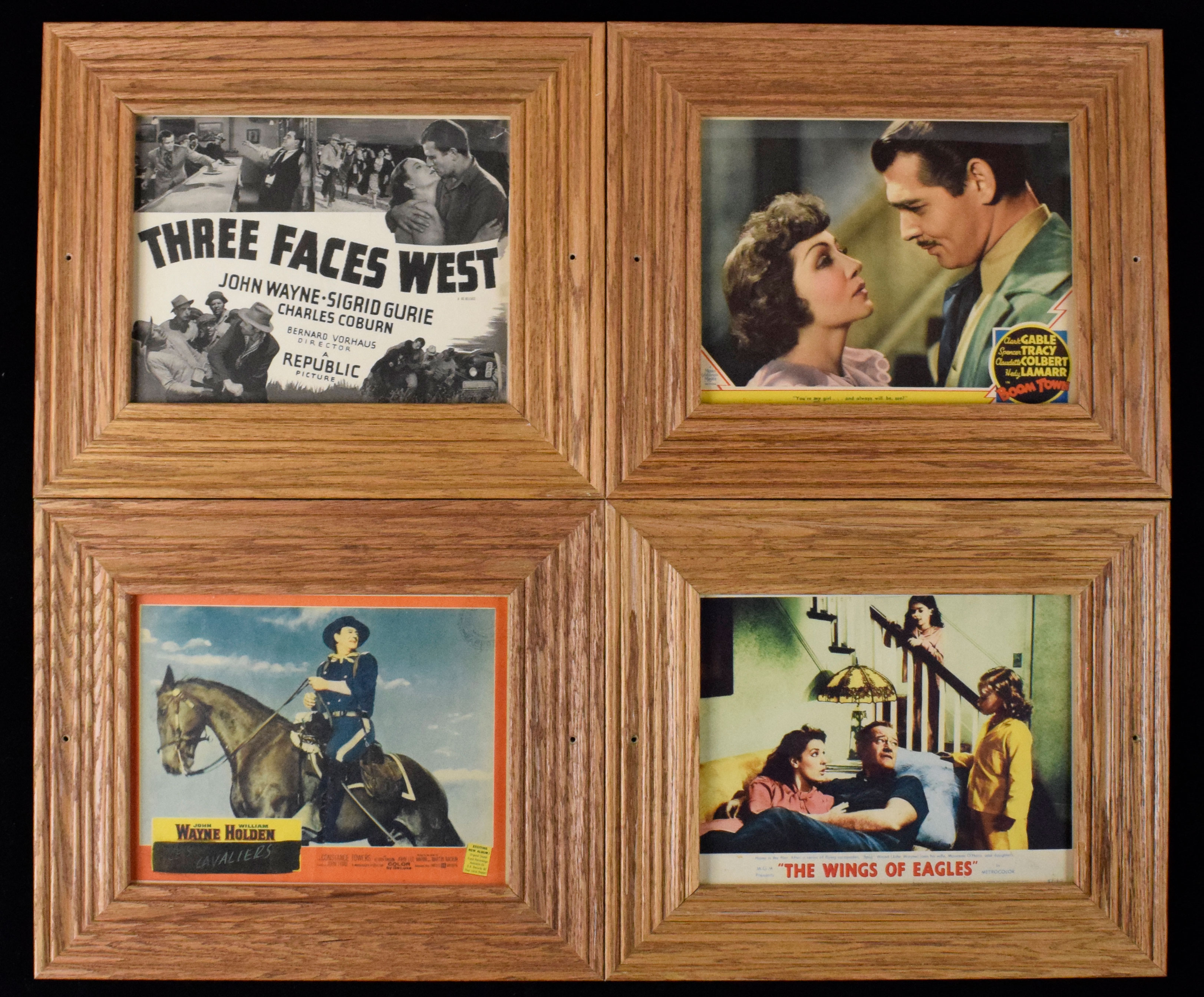 Description:Lot of (5) framed movie lobby cards (VG-NM). Frames measure approx. 16.5"x19.5". Includes 1940 "Boom Town", 1940 "Three Faces West" (tear visible at top right corner), 1957 "The Wings Of Eagles", 1959 "Les Cavaliers" Spanish version of "The Horse Soldiers", and 1963 "Dovovan's Reef". Due to framing, complete conditions are unknown, but most appear to average EX/MT overall. Range: VG-NM appearance