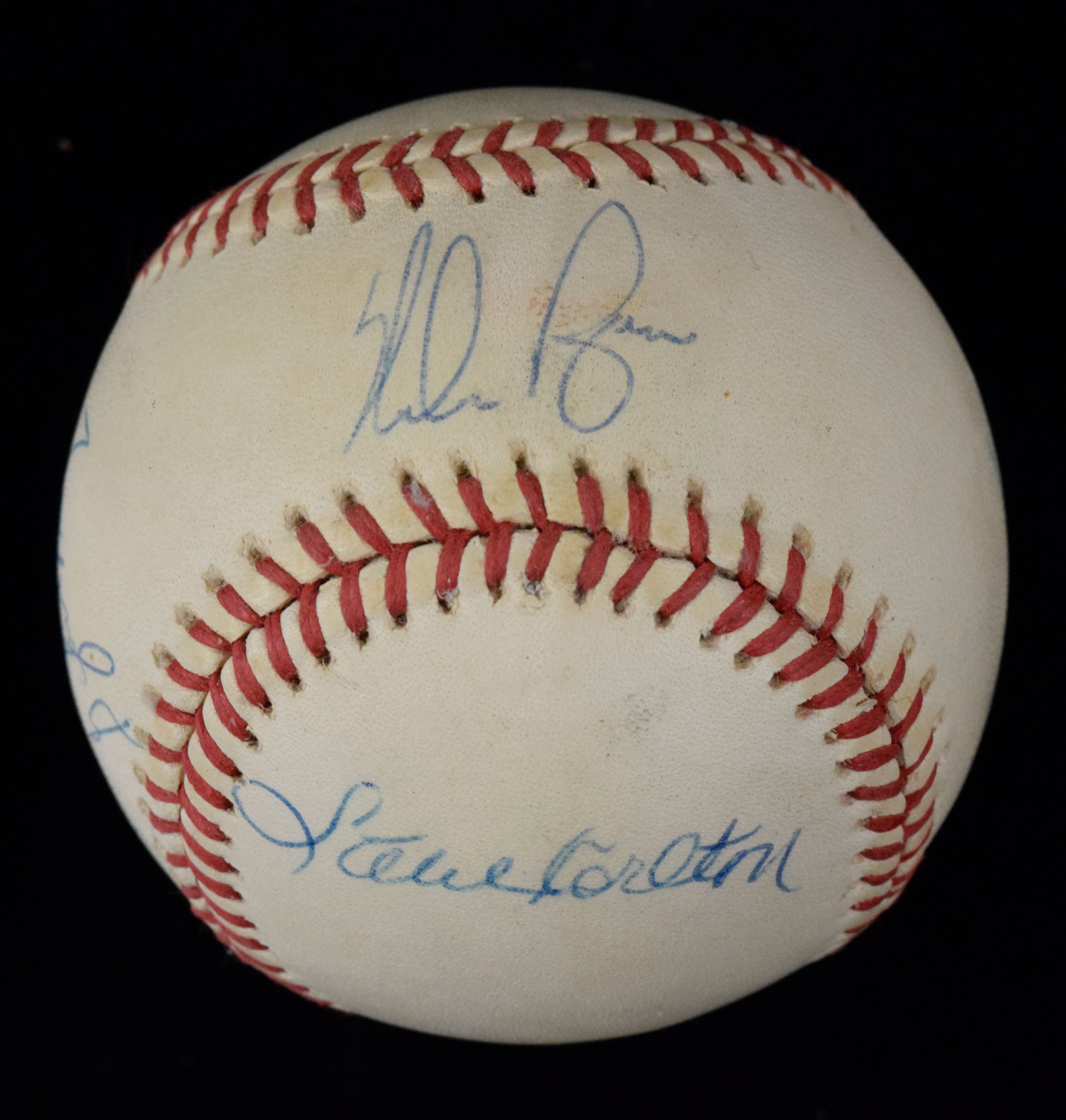 Description:300 Win Club multi-signed baseball - JSA (EX). W.White NL ball signed by (8) including Warren Spahn, Phil Niekro, Early Wynn, Tom Seaver, Don Sutton, Gaylord Perry, Nolan Ryan, and Steve Carlton. Signatures rate 7 to 9/10 (avg 8) out of 10. Includes LOA from JSA, with matching serial #ed sticker on the ball. Light toning and some minor scuff marks: EX