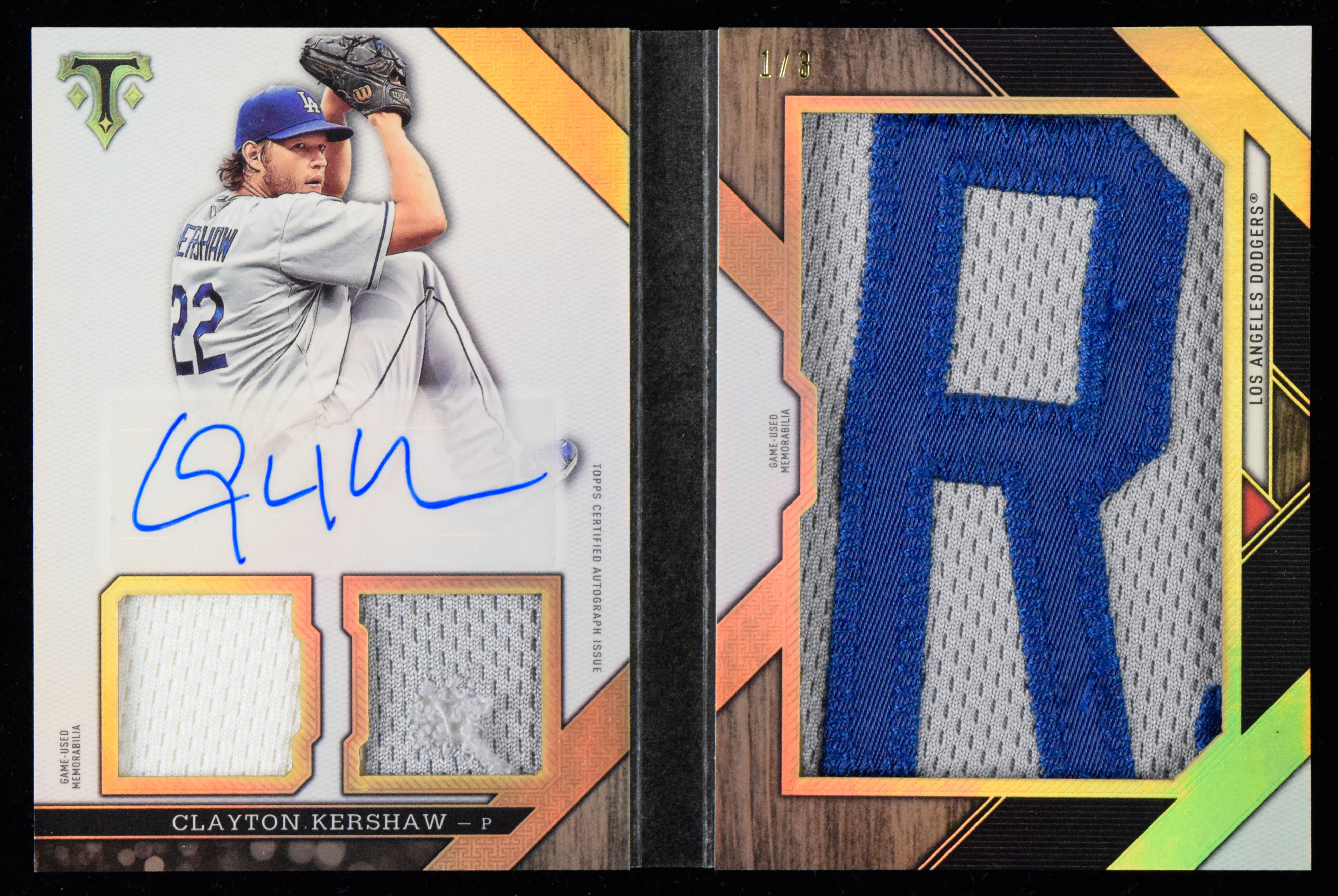 Description:Clayton Kershaw signed 2016 Topps Triple Threads booklet jumbo relics card serial #ed 1/3 (NM). 2016 Topps Triple Threads "Jumbo Plus Autographed Relics" #TTJAR-CK signed by Kershaw in blue marker. Signature rates 9/10 out of 10. The card is numbered 1/3: NM