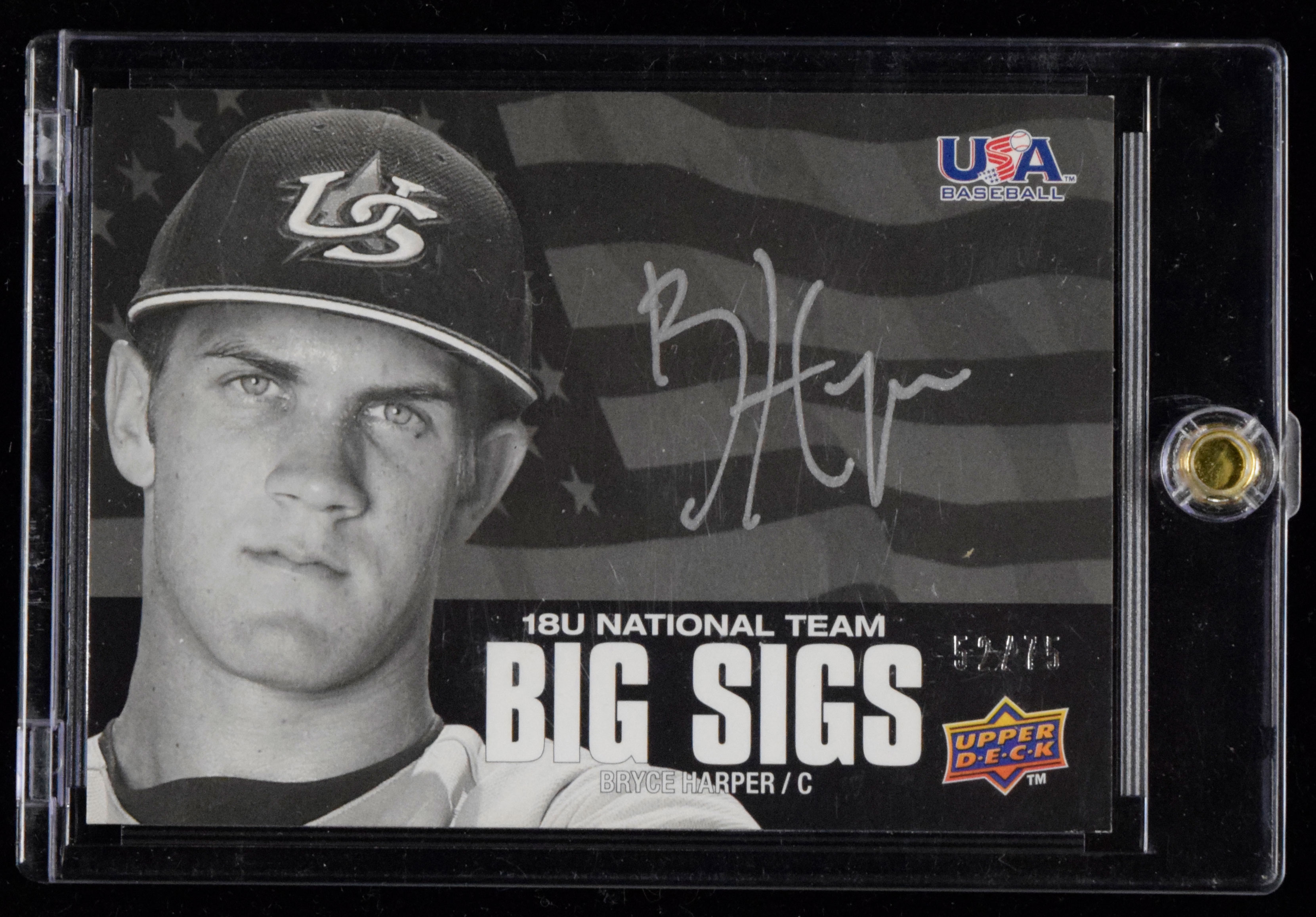 Description:Bryce Harper signed 2009 Upper Deck USA Baseball serial #ed rookie insert card (EX/MT). 2009 Upper Deck USA Baseball "Big Sigs: 18U National Team" #BS18U-BH signed by Harper in silver marker. Signature rates 9/10 out of 10. The card is numbered 52/75. Light edge wear: EX/MT