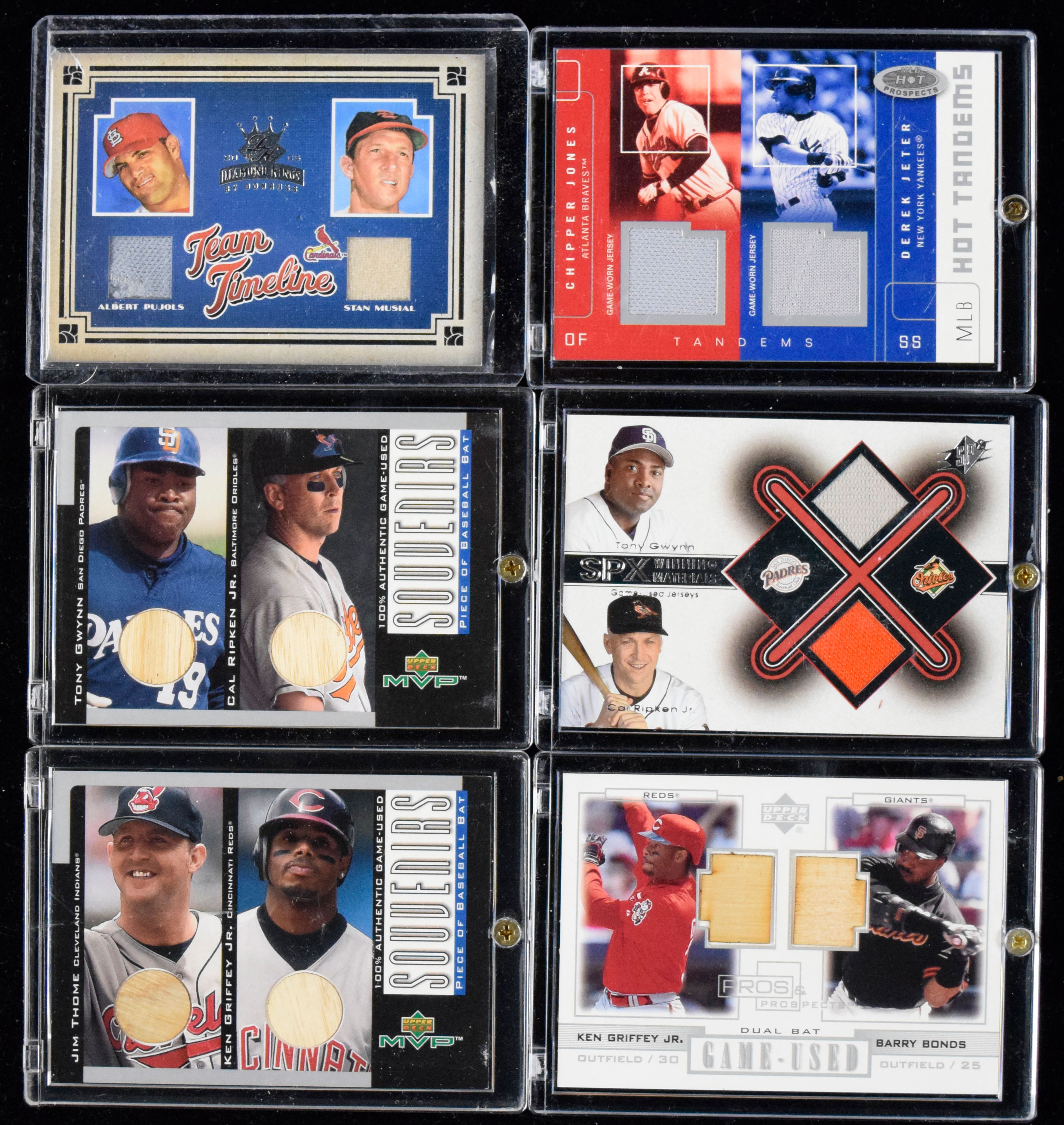 Description:Lot of (12) Baseball HOFers multi-relic swatch insert cards (NM-NM/MT overall). Includes (2) different Tony Gwynn / Cal Ripken Jr, Ken Griffey Jr / Jim Thome, Derek Jeter / Chipper Jones (#ed 13/100), Stan Musial / Albert Pujols (#ed 17/25), Ken Griffey Jr / Barry Bonds, (2) different Ken Griffey Jr / Sammy Sosa, Derek Jeter / Alex Rodriguez, Chipper Jones / Albert Pujols, Ken Griffey Jr / Alex Rodriguez / Sammy Sosa, and Derek Jeter / Alex Rodriguez / Nomar Garciaparra: NM-NM/MT overall
