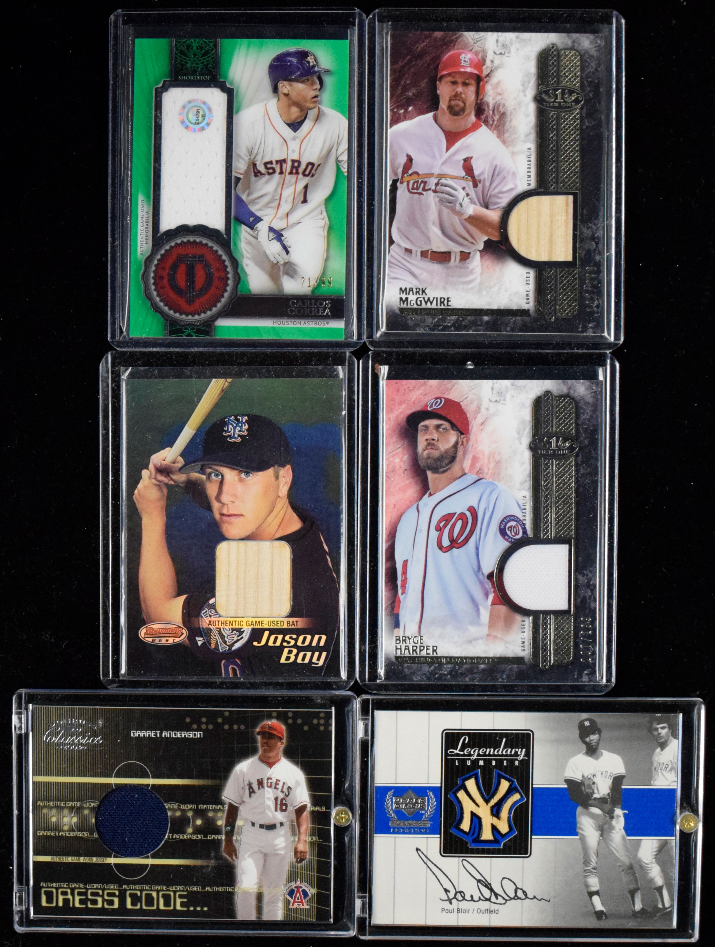 Description:Lot of (37) baseball game used relic swatch insert cards including some stars & fan favorites (NM-NM/MT overall). Includes (5) Mark McGwire, Bryce Harper (#ed 207/299), Paul Blair, Carlos Correa (#ed 71/99), (2) Jason Bay, (2) Garret Anderson, (9) Edgardo Alfonzo, (2) Brady Anderson, (2) Yasiel Puig, Joe Blanton, Jay Bell, Chad Billingsley, (2) Hank Blalock, (2) Derek Bell, (4) Wilson Betemit, and Vida Blue / Dennis Martinez dual-relics card: NM-NM/MT overall