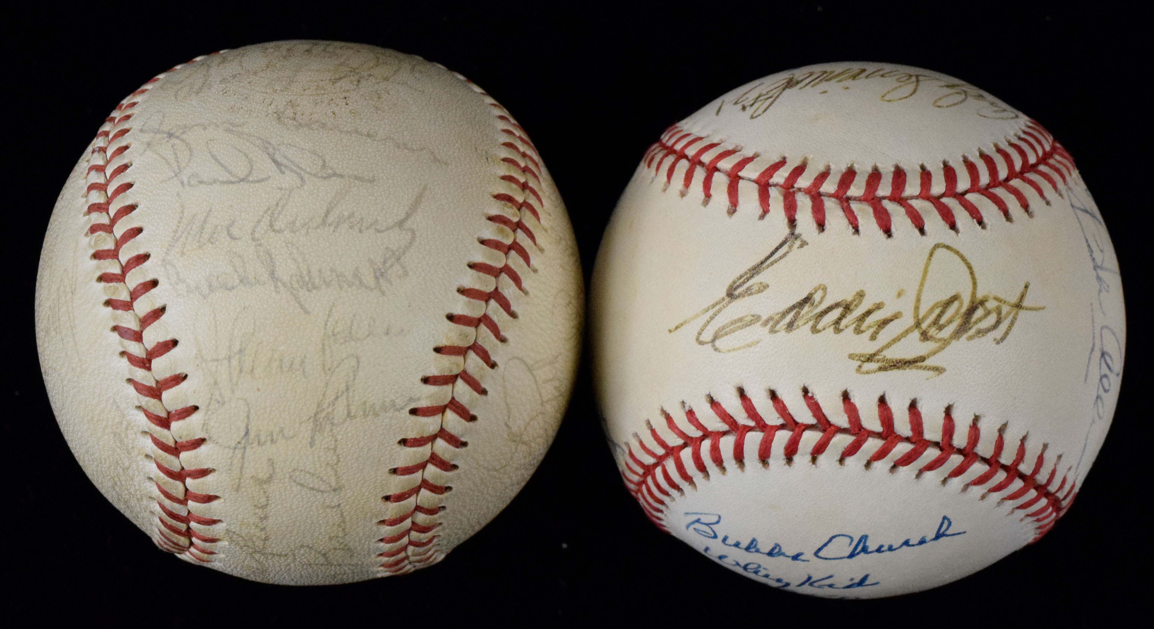Description:1966 Baltimore Orioles team signed baseball plus Philadelphia Phillies and A's multi-signed ball (EX-EX/MT). Includes J.Cronin AL ball signed by (27) members of the 1966 World Series champion Orioles: Hank Bauer, Brooks Robinson, Jim Palmer, Luis Aparicio, Boog Powell, Stu Miller, Curt Blefary, Steve Barber, Russ Snyder, Moe Drabowsky, Paul Blair, Dave Johnson, Andy Etchebarren, Sam Bowens, and others (Frank Robinson, Dave McNally, Wally Bunker, and John Miller are clubhouse signed). Signatures rate 4/5 to 8 (avg 6/7) out of 10 (ball EX-EX/MT). Also includes L.Coleman NL ball (toning) signed by (11): Robin Roberts, Dick Allen, Dallas Green, Johnny Callison, Andy Seminick, Art Mahaffey, Bubba Church with "Whiz Kids 1950" inscription, Jack Baldschun, Eddie Joost, John Briggs, and Howie Bedell. Signatures rate 3/4 (Green, Callison) to 9 (avg 7) out of 10: EX-EX/MT