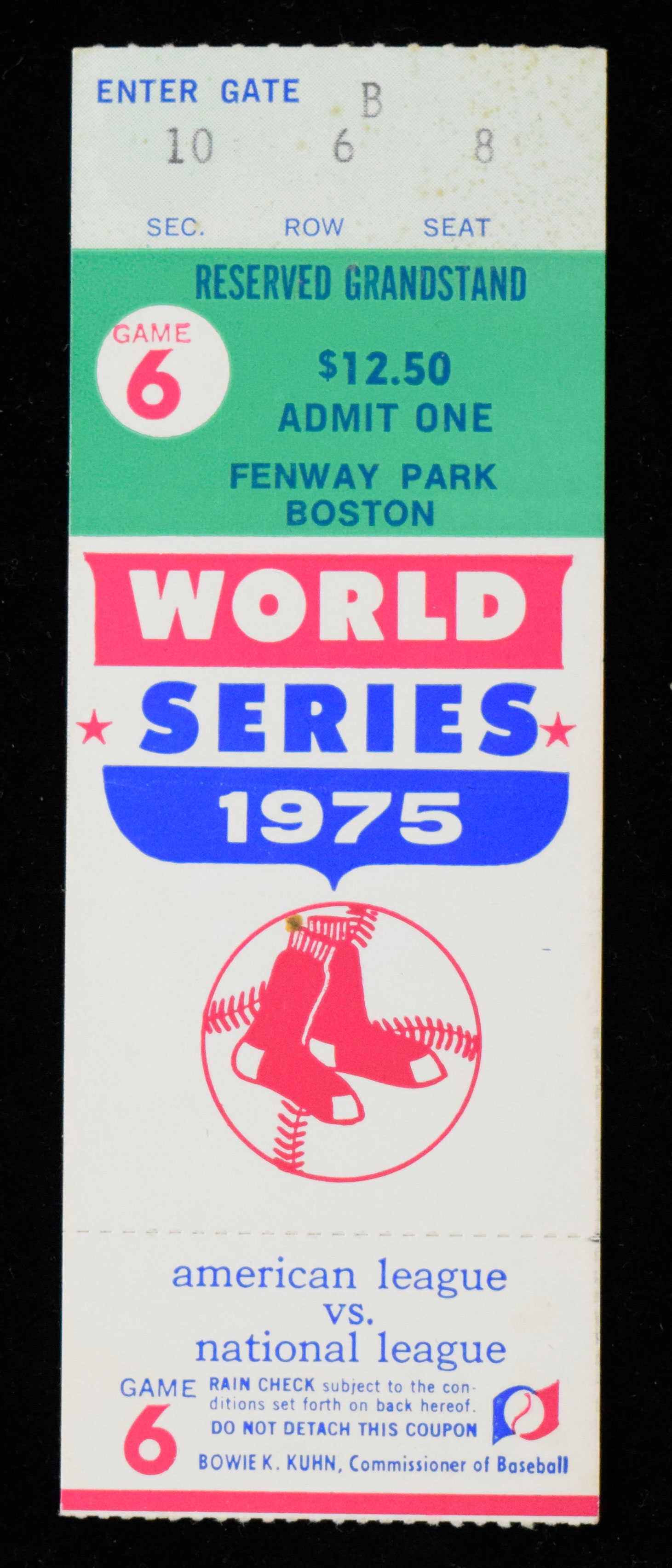 Description:1975 World Series Game 6 ticket stub - Fisk HR game (EX). Fenway Park ticket stub from Game 6 in which the Boston Red Sox defeated the Cincinnati Reds by a score of 7-6 on Carlton Fisk's dramatic 12th inning walk-off HR. Minimal structural wear but has some staining near the top edge: EX