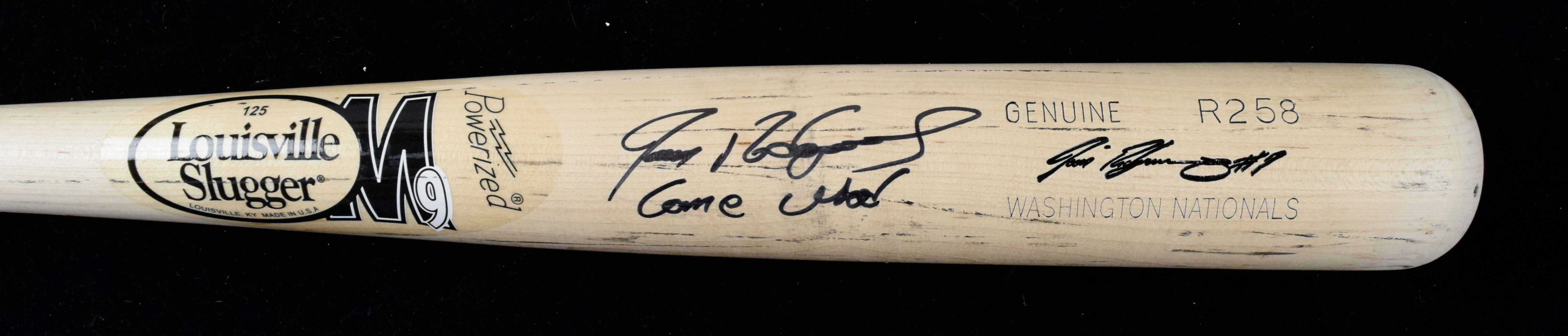 Description:2010 Ivan Rodriguez signed and inscribed "Game Used" baseball bat (EX). 34" Louisville Slugger R258 Ivan Rodriguez model bat with production date and length/weight stamped on the knob. Rodriguez signed the bat in black marker and added "Game Used" inscription. Signature rates 9 out of 10. Minimal use, but has numerous rack marks. Includes certificate of provenance from Rodriguez: EX