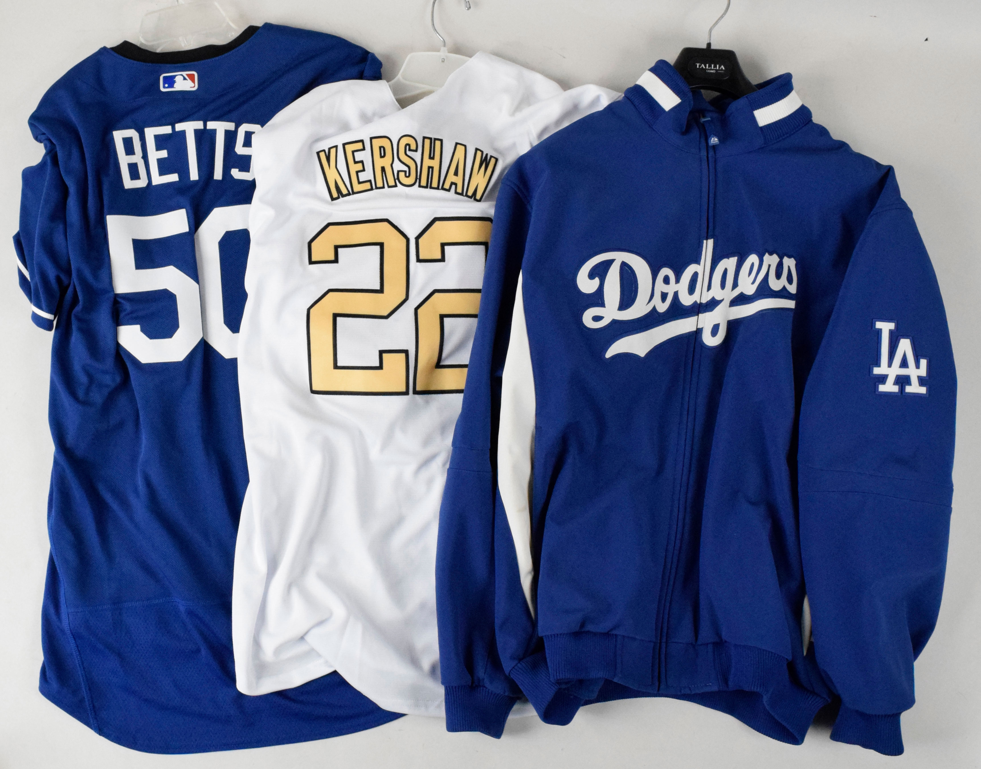Description:Lot of Los Angeles Dodgers jackets, jerseys, and apparel (VG-NM/MT). Includes a Majestic size 2XL Dodgers jacket, Columbia size XXL Dodgers windbreaker, Majestic size 52 Dodgers #1 Pee Wee Reese jersey with 1997 Jackie Robinson patch, Russell Athletic size 52 Dodgers #31 Mike Piazza jersey, Nike size XXL Dodgers #22 Clayton Kershaw 2022 All-Star Game jersey (new with tags), Nike size 52 Dodgers #50 Mookie Betts jersey, Majestic size 52 Dodgers #16 Will Smith jersey, Majestic size 56 Dodgers #35 Cody Bellinger jersey, Nike size 52 Dodgers #5 Corey Seager 2020 World Series Champions jersey, Majestic size 56 Dodgers #5 Corey Seager jersey (stained), Majestic size 52 Dodgers #16 Andre Ethier jersey, Majestic size 52 Dodgers patriotic trimmed jersey with American flag patch, Majestic size XL Dodgers jersey, Majestic size 2XL Dodgers jersey, and a few Dodgers t-shirts. Most appear to average EX/MT-NM overall. Range: VG-NM/MT
