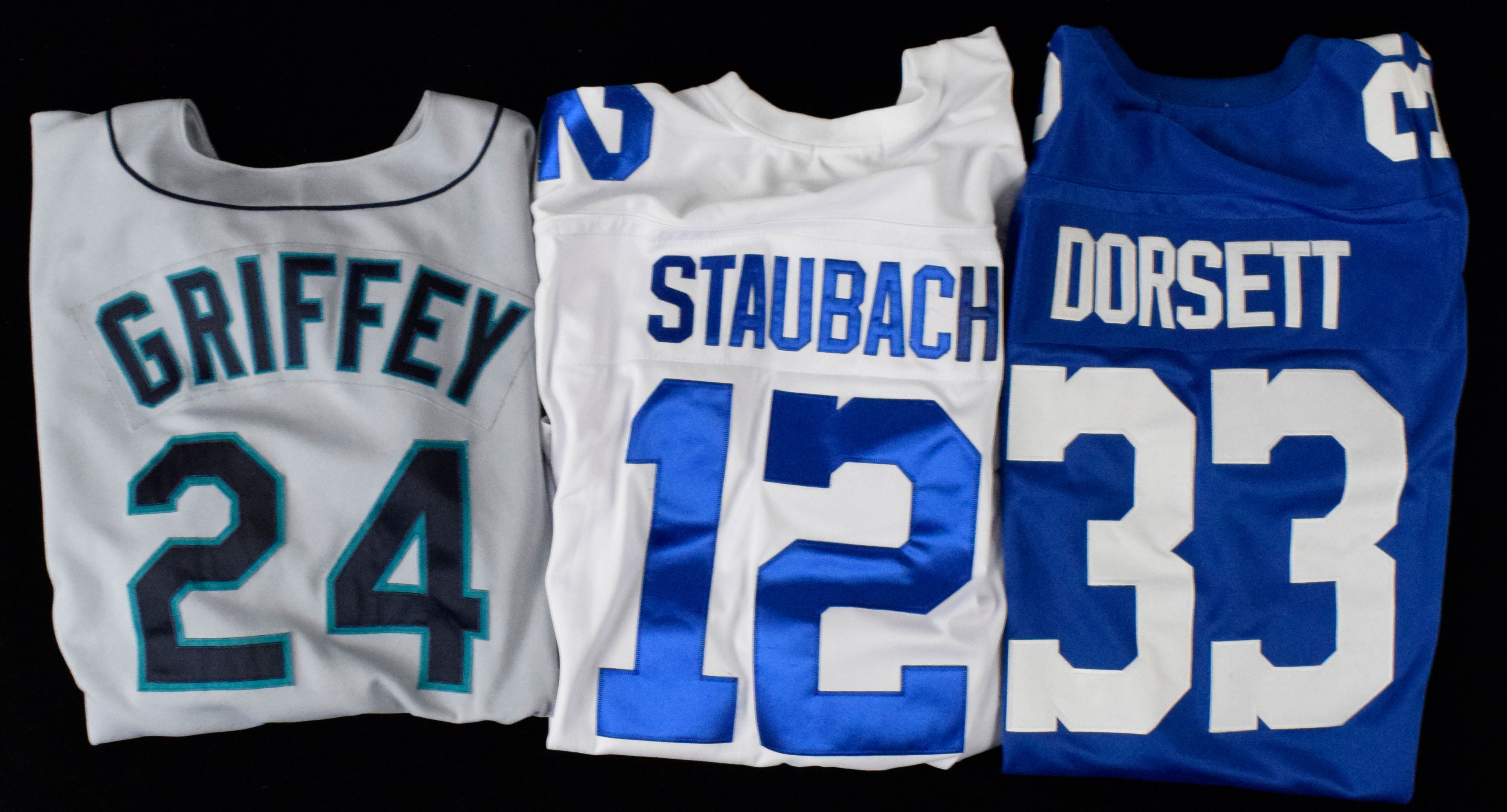Description:Lot of baseball and football jackets, jerseys, and apparel (VG-NM/MT). Includes a Columbia size XL Dallas Cowboys jersey, Columbia size XXL jacket (no team), faux Mitchell & Ness size 54 Cowboys #12 Roger Staubach jersey, Mitchell & Ness size 54 Cowboys #33 Tony Dorsett jersey, Mitchell & Ness size 54 Cowboys #88 Michael Irvin jersey, Starter size XL Cowboys #22 Emmitt Smith sweatshirt (stained), Nike size XXL Raiders #81 Tim Brown jersey, Russell Athletic size 52 Baltimore Orioles #8 Cal Ripken Jr jersey, Russell Athletic size 52 Seattle Mariners #24 Ken Griffey Jr jersey, Majestic size 52 Mariners #24 Ken Griffey Jr jersey, Majestic size 52 San Francisco Giants #25 Barry Bonds jersey, Russell Athletic size 52 Mariners #3 Alex Rodriguez jersey, Russell Athletic size 52 St. Louis Cardinals #51 Willie McGee jersey, and Russell Athletic size 52 Orioles #24 Eric Davis jersey. Most appear to average EX/MT-NM overall. Range: VG-NM/MT