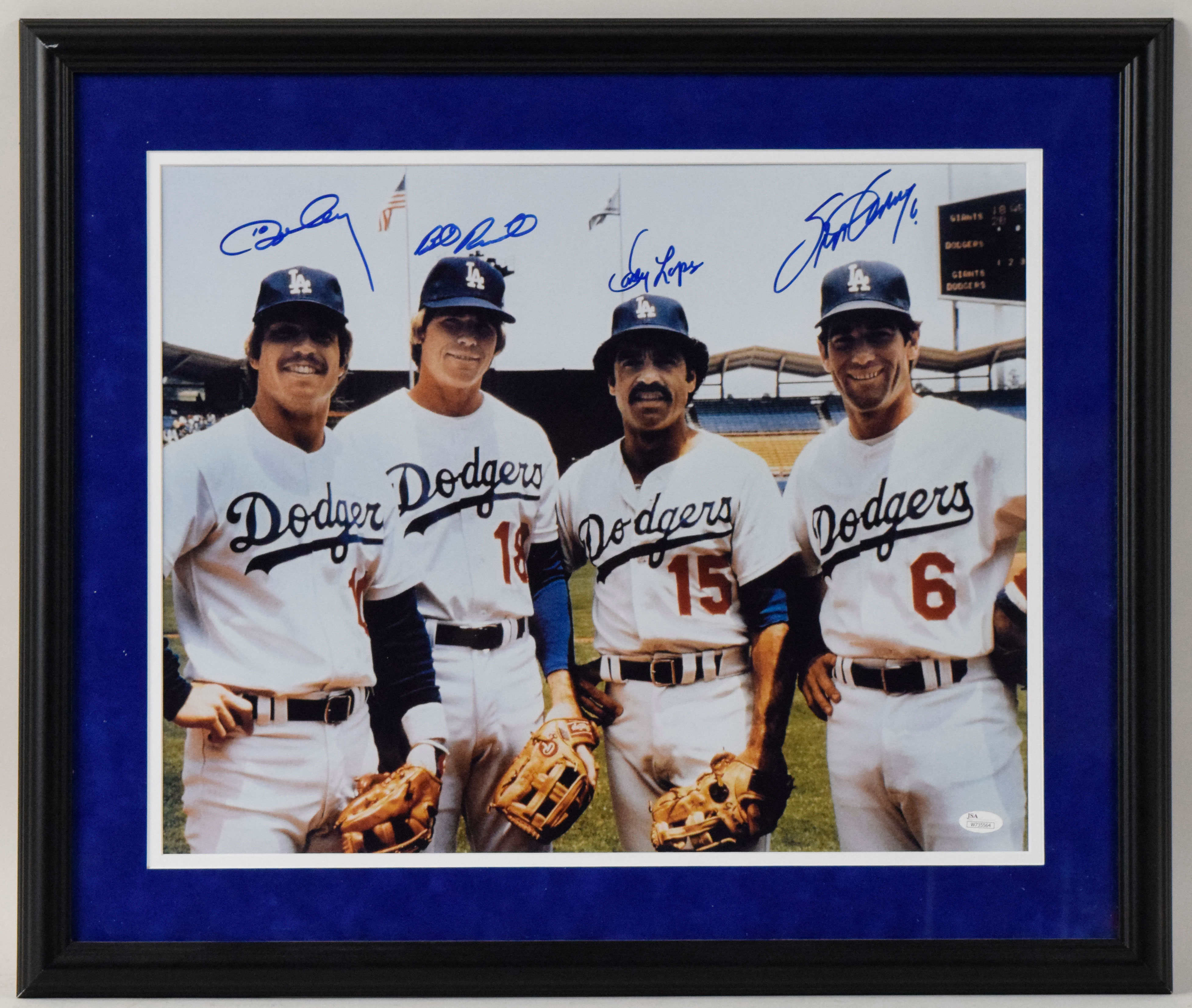Description:Steve Garvey, Ron Cey, Davey Lopes, Bill Russell multi-signed oversize framed photo - JSA (NM). Frame measures approx. 22"x26". All four signed the photo in blue marker. Signatures rate 8/9 to 10 out of 10. JSA serial #ed sticker is on the photo. Due to framing, complete condition is unknown: NM appearance