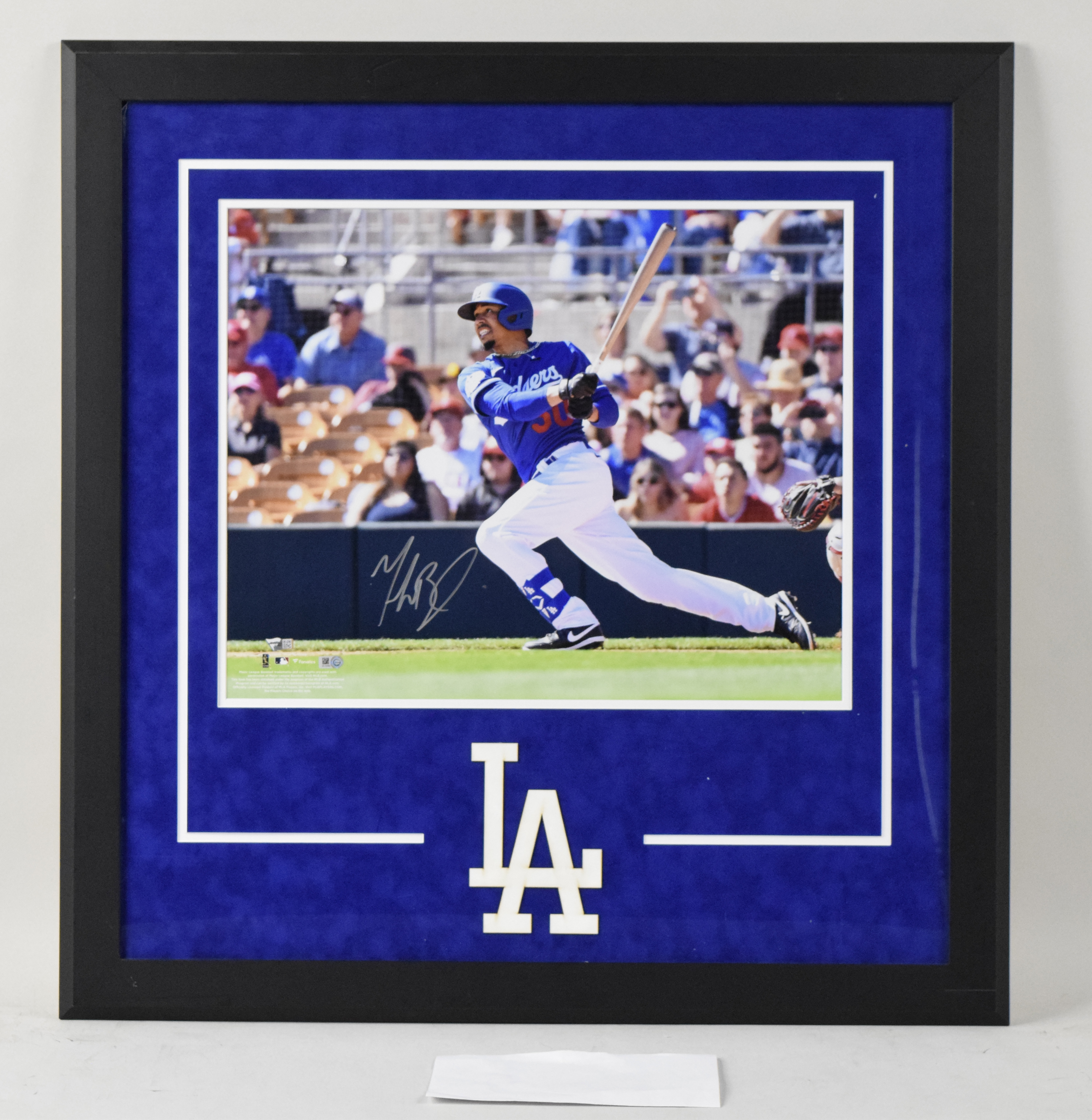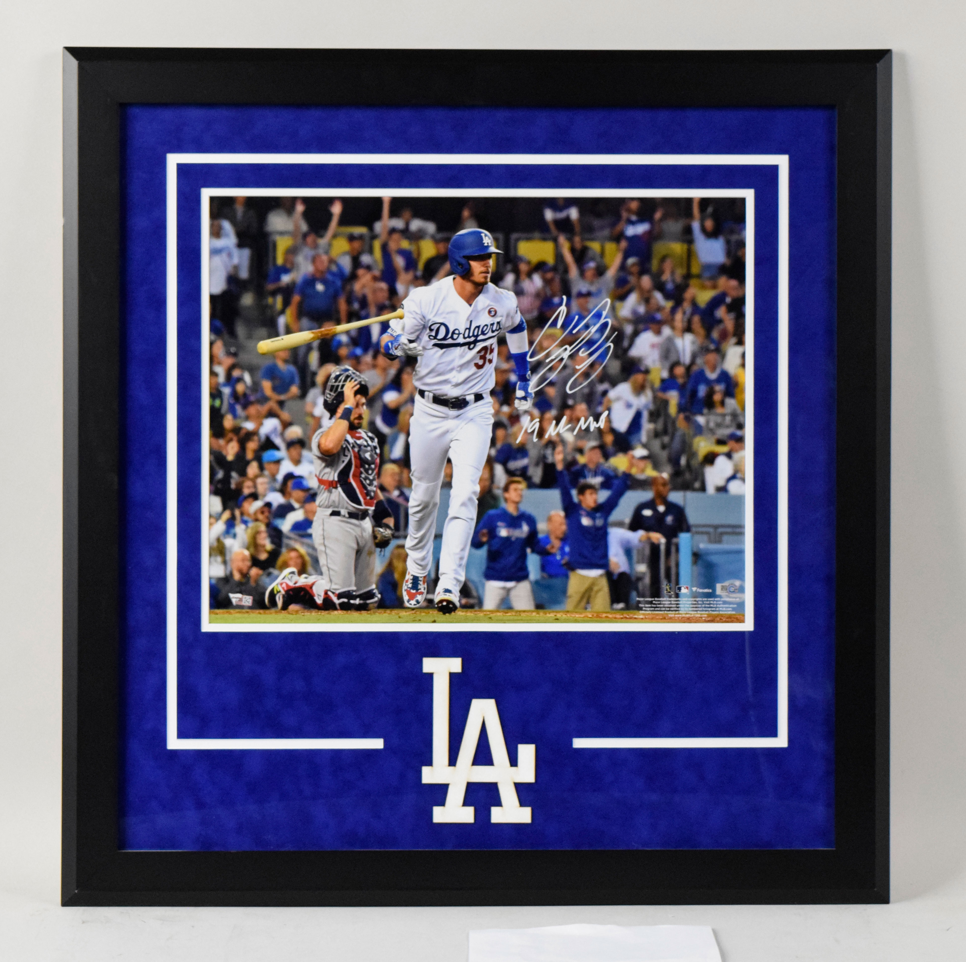 Description:Mookie Betts, Cody Bellinger, and Max Muncy signed oversize framed photos - Fanatics & MLB Authenticated (NM-NM/MT). Each frame measures approx. 30"x31". Bellinger added "19 NL MVP" inscription to his autograph. Signatures rate 9 to 10 out of 10. All three photos have both Fanatics and MLB Authenticated serial #ed hologram stickers. Due to framing, complete conditions are unknown: NM-NM/MT appearance