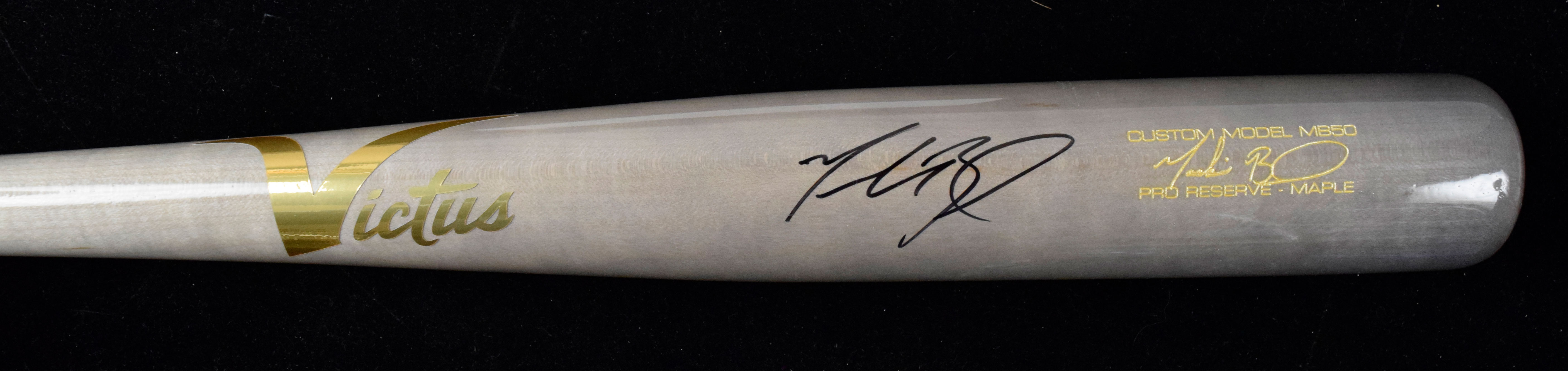 Description:Mookie Betts signed professional model baseball bat - Fanatics & MLB Authenticated (NM unused). 33.5" Victus MB50 Mookie Betts custom model bat signed by Betts in black marker. Signature rates 9 out of 10. Fanatics and MLB Authenticated serial #ed hologram stickers are on the bat. Remains in unused condition: NM