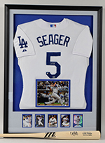 Description:Corey Seager signed jersey (framed) and signed professional model baseball bat - Fanatics & MLB Authenticated (NM-NM/MT). Includes 34" Marucci CS5-S Corey Seager pro model bat signed by Seager in black marker rating 9 out of 10 (unused), and 29"x38.5" framed Los Angeles Dodgers #5 Corey Seager jersey signed by Seager in silver marker rating 8 out of 10. Fanatics and MLB Authenticated serial #ed hologram stickers are on both items: NM-NM/MT