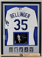Description:Cody Bellinger signed oversize framed jersey & photo display plus signed baseball bat - Fanatics & MLB Authenticated (NM-NM/MT). Includes 33.5" Louisville Slugger C243M model bat signed by Bellinger in black marker with "1st Career Cycle 7/15/17" inscription, and 28.5"x38.5" framed display containing a Los Angeles Dodgers #35 Cody Bellinger jersey signed by Bellinger in silver marker as well as a Bellinger signed photo with "1st Career Cycle 7/15/17" inscription. Signatures rate 8/9 to 10 out of 10. The bat, jersey, and photo each have Fanatics and MLB Authenticated serial #ed hologram stickers: NM-NM/MT