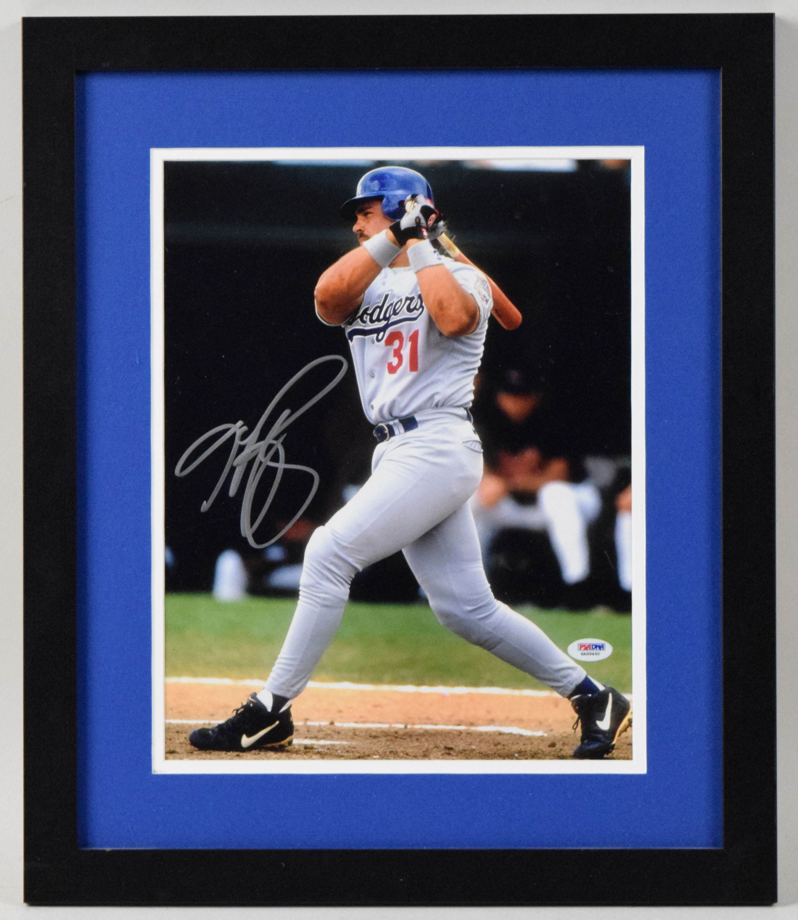 Description:Mike Piazza signed oversize framed photograph - PSA/DNA (NM). Frame measures approx. 17"x20". Piazza signed the photo in silver marker. Signature rates 9/10 out of 10. PSA/DNA serial #ed sticker is on the photo. Due to framing, complete condition is unknown: NM appearance