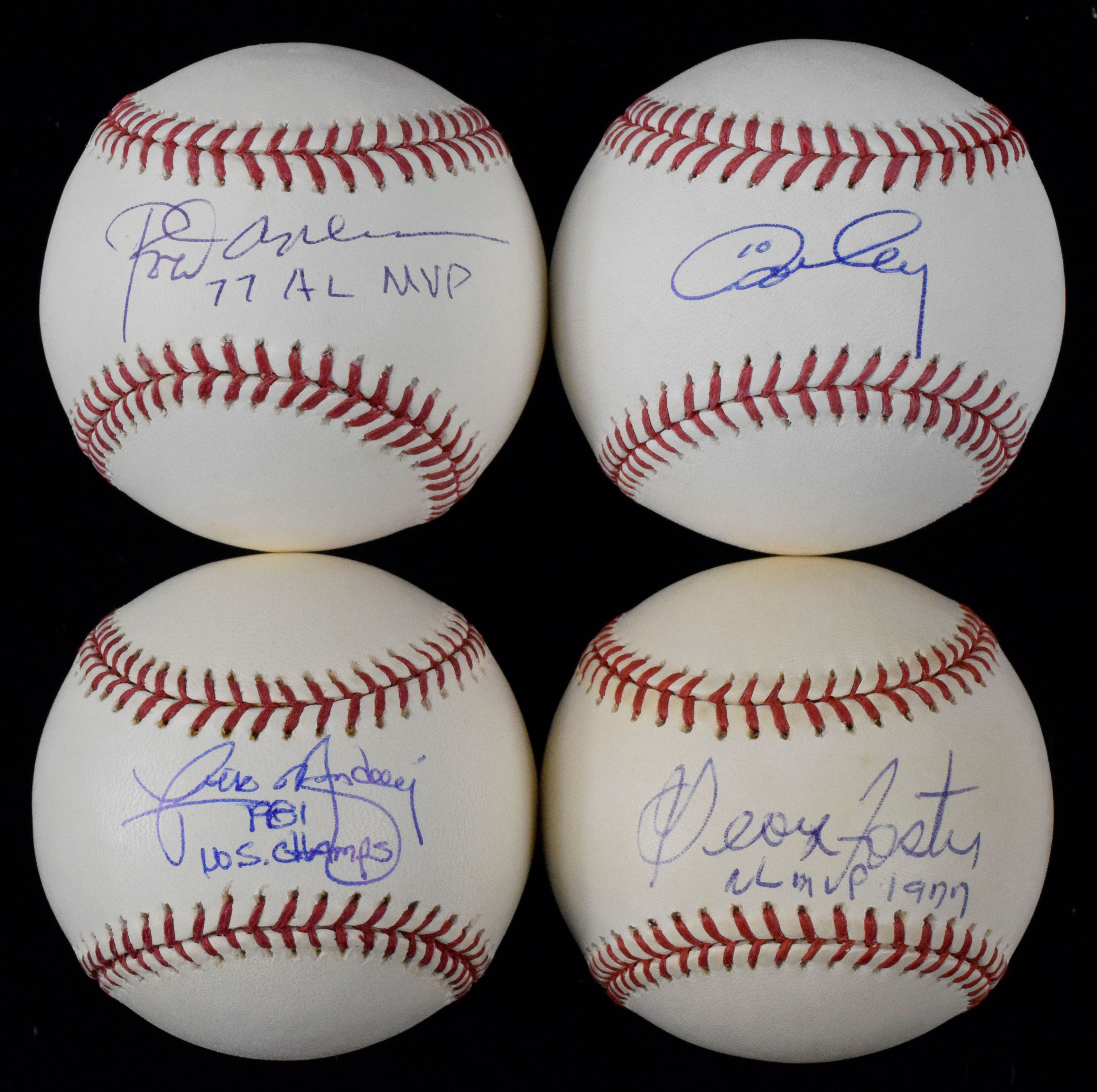 Description:Lot of (6) 1970s era All-Stars signed baseballs (EX/MT-NM/MT). Includes B.Selig ML ball (light toning) signed by Rod Carew with "77 AL MVP" inscription (PSA/DNA), L.Coleman NL ball (light toning) signed by George Foster with "NL MVP 1977" inscription (MLB Authenticated), R.Manfred ML ball signed by Ron Cey (MLB Authenticated), B.Selig ML ball (light toning) signed by Davey Lopes, B.Selig ML ball signed by Bill Russell, and 2005 Washington Nationals inaugural season ball signed by Rick Monday with "1981 WS Champs" inscription (Beckett). Signatures rate 7 (Russell) to 9/10 (avg 8) out of 10: EX/MT-NM/MT
