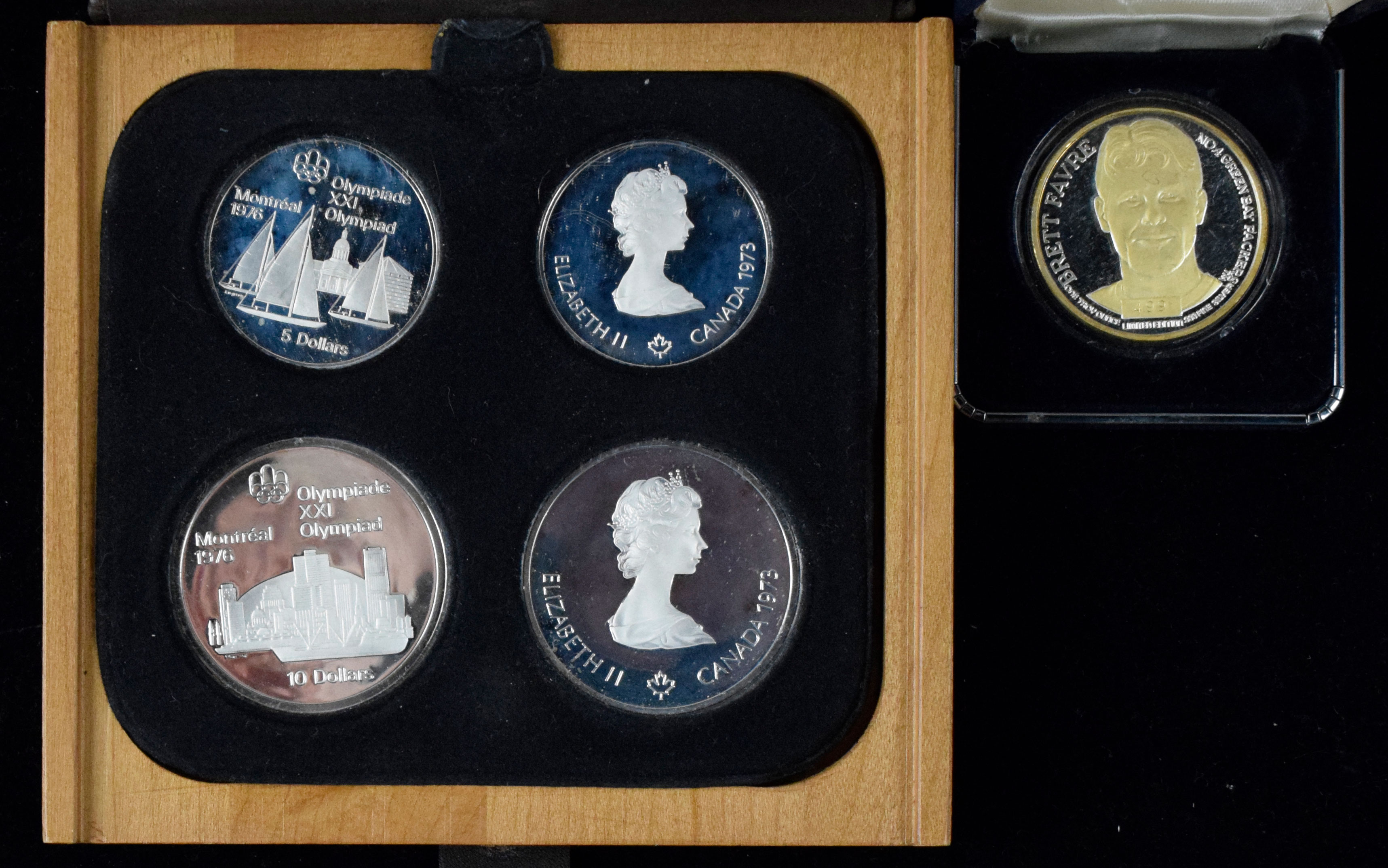 Description:Lot of (5) silver coins (EX/MT-NM/MT). Includes 1970s Canadian Olympic Coin Proof Set with (2) $10 coins both containing 1.44-oz. of silver and (2) $5 coins both containing .723-oz. of silver, and a Brett Favre silver coin weighing 1-oz: EX/MT-NM/MT