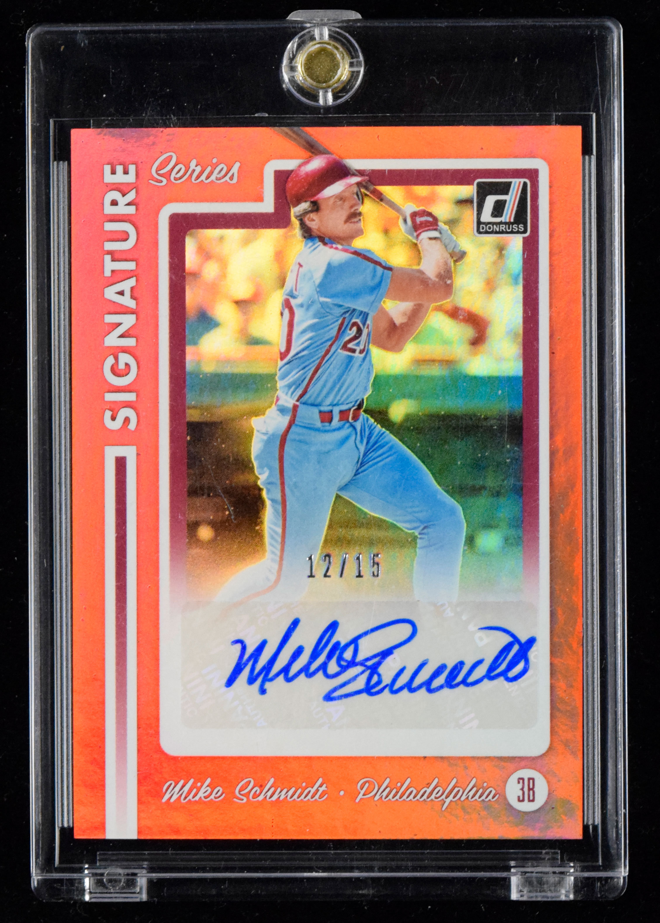 Description:Mike Schmidt signed 2017 Donruss insert card serial numbered 12/15 (NM/MT). 2017 Donruss "Signature Series Red" #SS-MS signed by Schmidt in blue marker. Signature rates 10 out of 10. The card is #ed 12/15: NM/MT