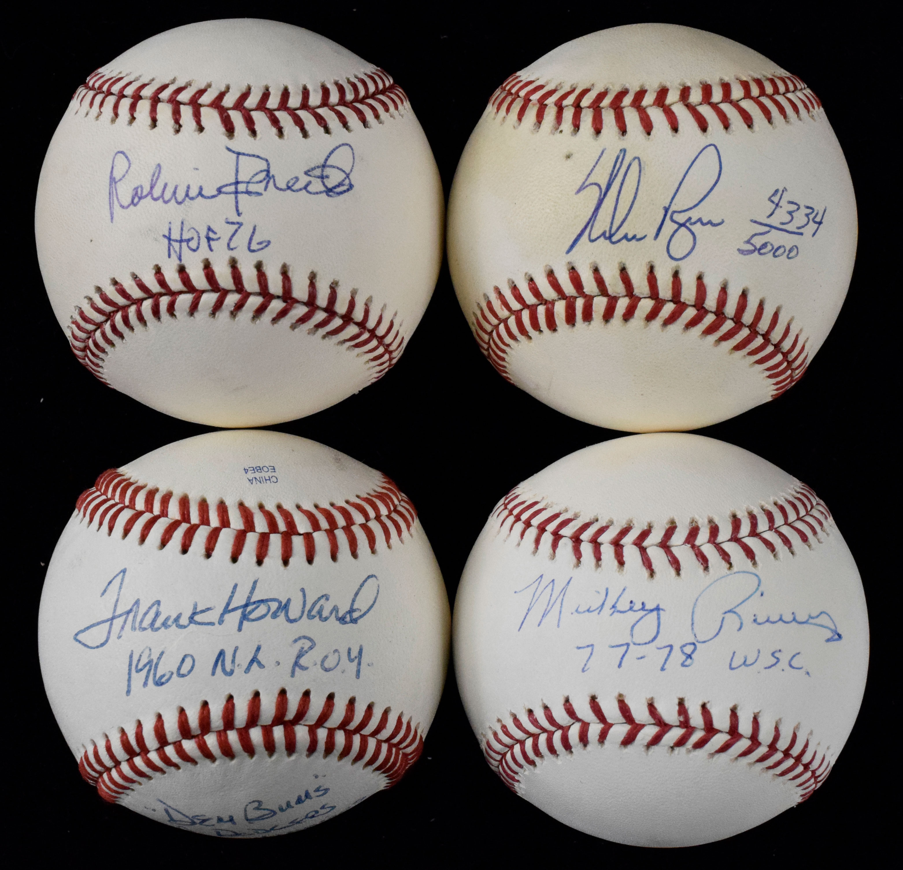 Description:Lot of (8) signed baseballs including stars and HOFers (VG/EX-NM/MT). Includes B.Selig ML ball signed by Robin Roberts with "HOF 76" inscription, B.Brown AL ball (toning) signed by Nolan Ryan (#ed 4334/5000), Markwort Official League ball signed by Maury Wills with "#30 LA Dodgers" inscription (personalized to Dennis), Rawlings Official League ball signed by Frank Howard with "1960 NL ROY" "Dem Bums" "LA Dodgers" "WS Champions 1959-1963" inscriptions, B.Selig ML ball signed by Ryan Howard (MLB Authenticated), B.Selig ML ball signed by Mickey Rivers with "77-78 WSC" inscription (Steiner), R.Manfred ML ball signed by Ronald Torreyes (Steiner), and B.Selig ML ball dual-signed by Greg Luzinski and Gary Matthews. Signatures rate 6/7 (Ryan Howard) to 9/10 (avg 8) out of 10: VG/EX-NM/MT